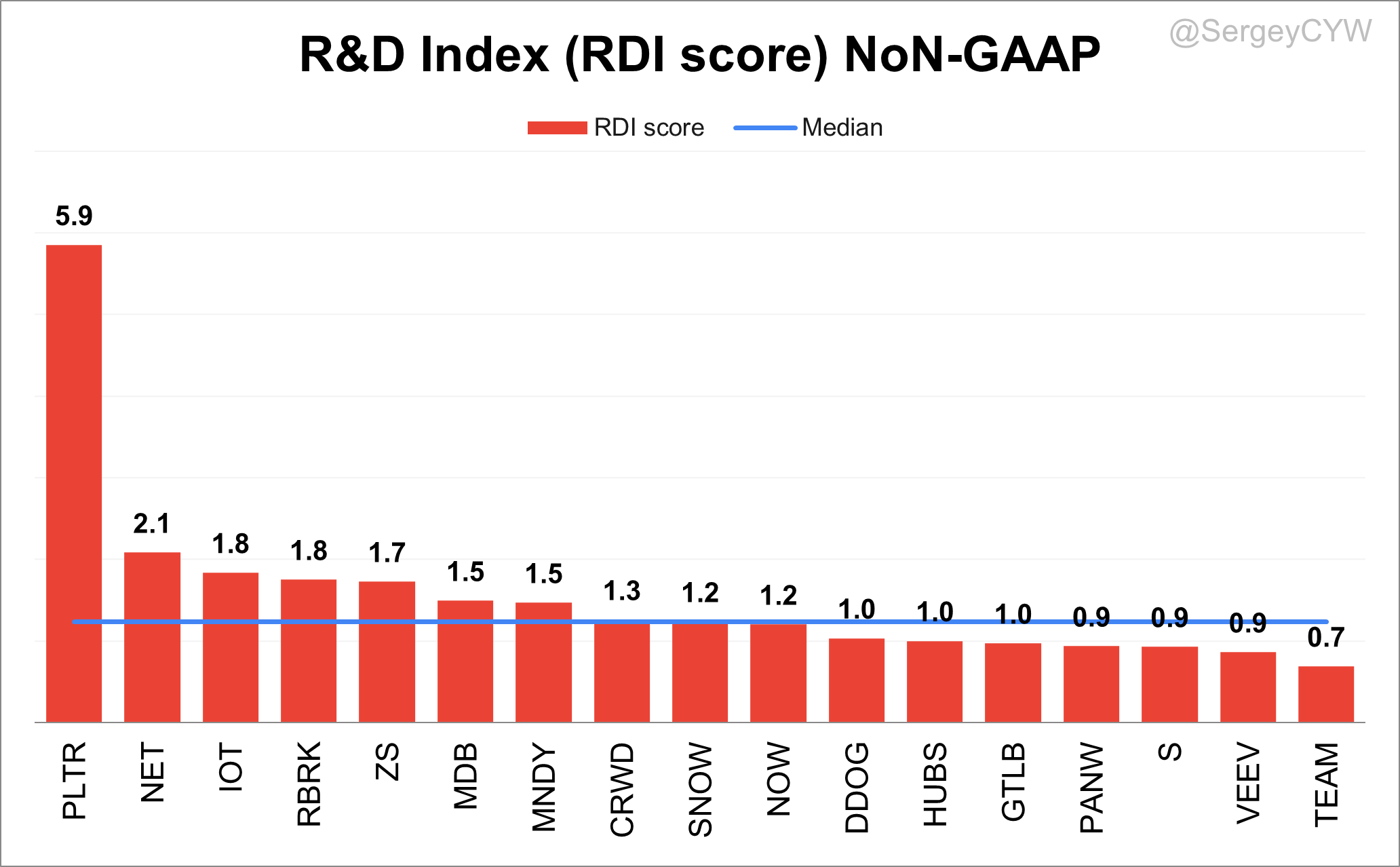 At the lower end, $TEAM posted an RDI Score of 0.7, falling at the industry median—indicating less efficient R&D investment compared to peers.