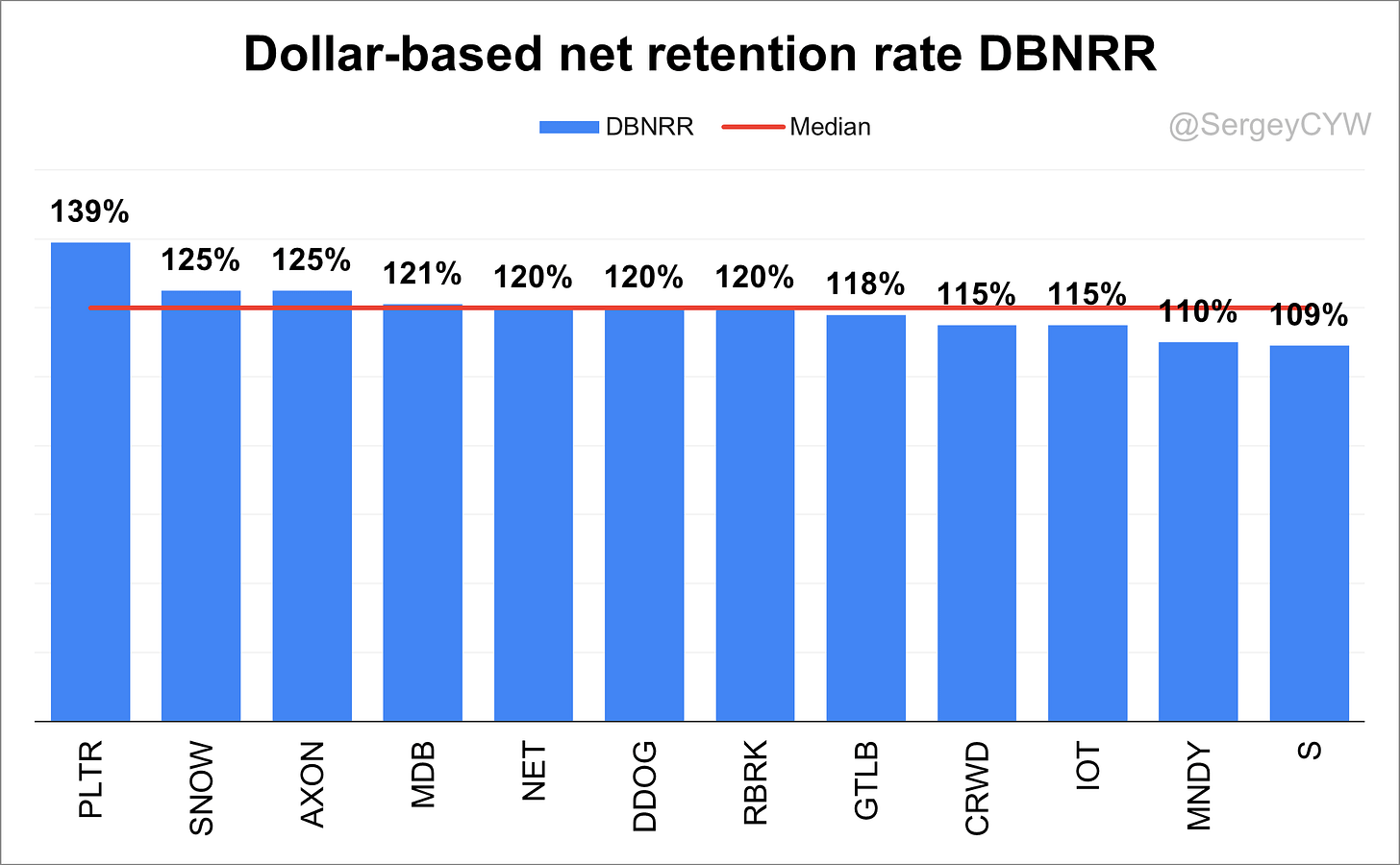 On the lower end, $MNDY reports 110%, and $S at 109%, though it’s worth noting that $MNDY’s DBNRR for medium and large customers is stronger at 116%.