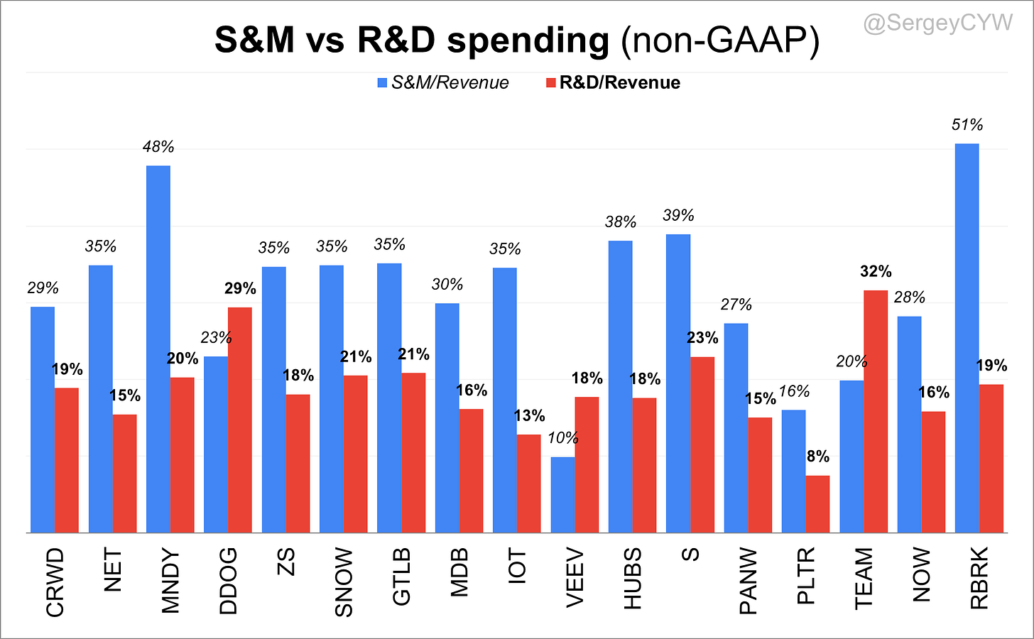 For example, $SNOW reports the highest levels at 33%, followed by $S and $TEAM at 29%. While $SNOW may justify higher SBC through strong revenue growth, $CFLT’s growth sits at 19%, and $S is growing at 23% YoY and continues to decelerate—raising concerns about the sustainability of such high compensation.