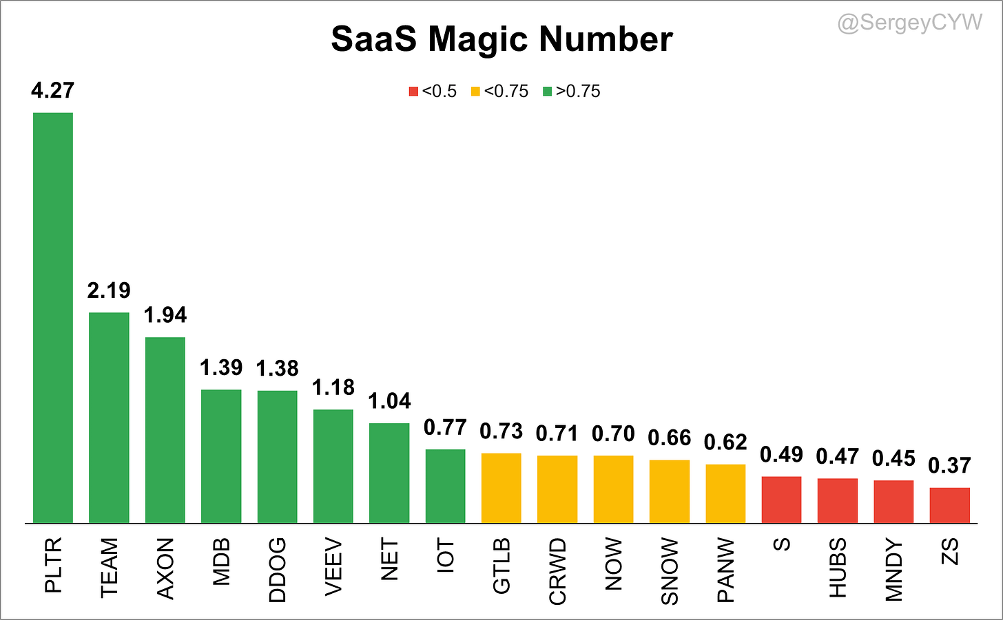 🟢Magic Number > 0.75: $PLTR, $TEAM, $AXON, $MDB, $VEEV, $DDOG, $NET, $IOT.