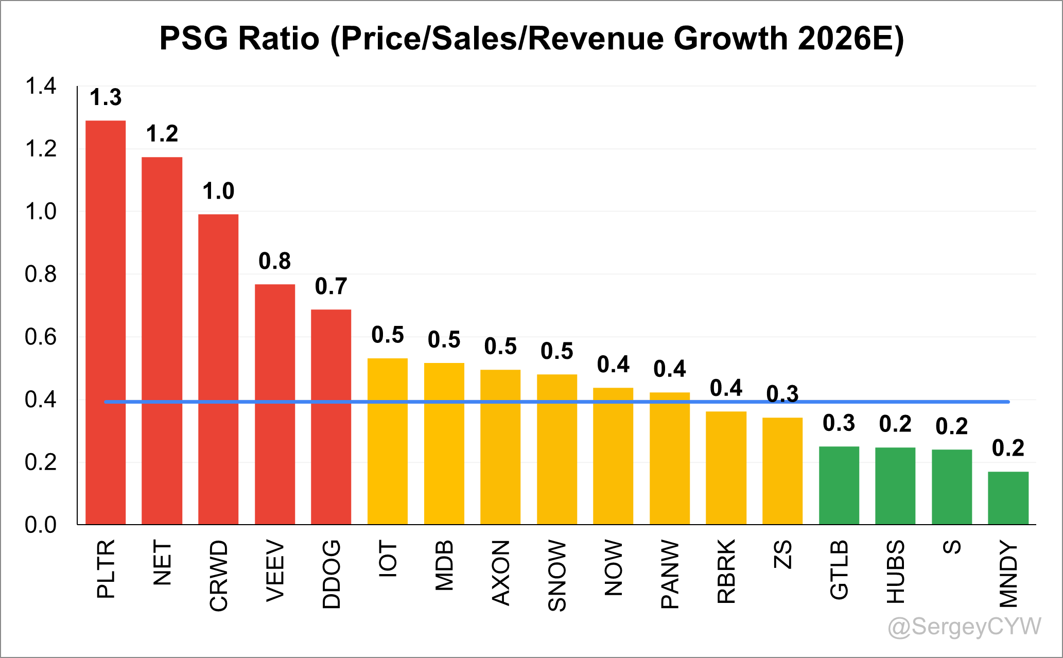 Companies trading with a PSG ratio above the median include $PLTR, $CRWD, $VEEV, $DDOG, and $NET.