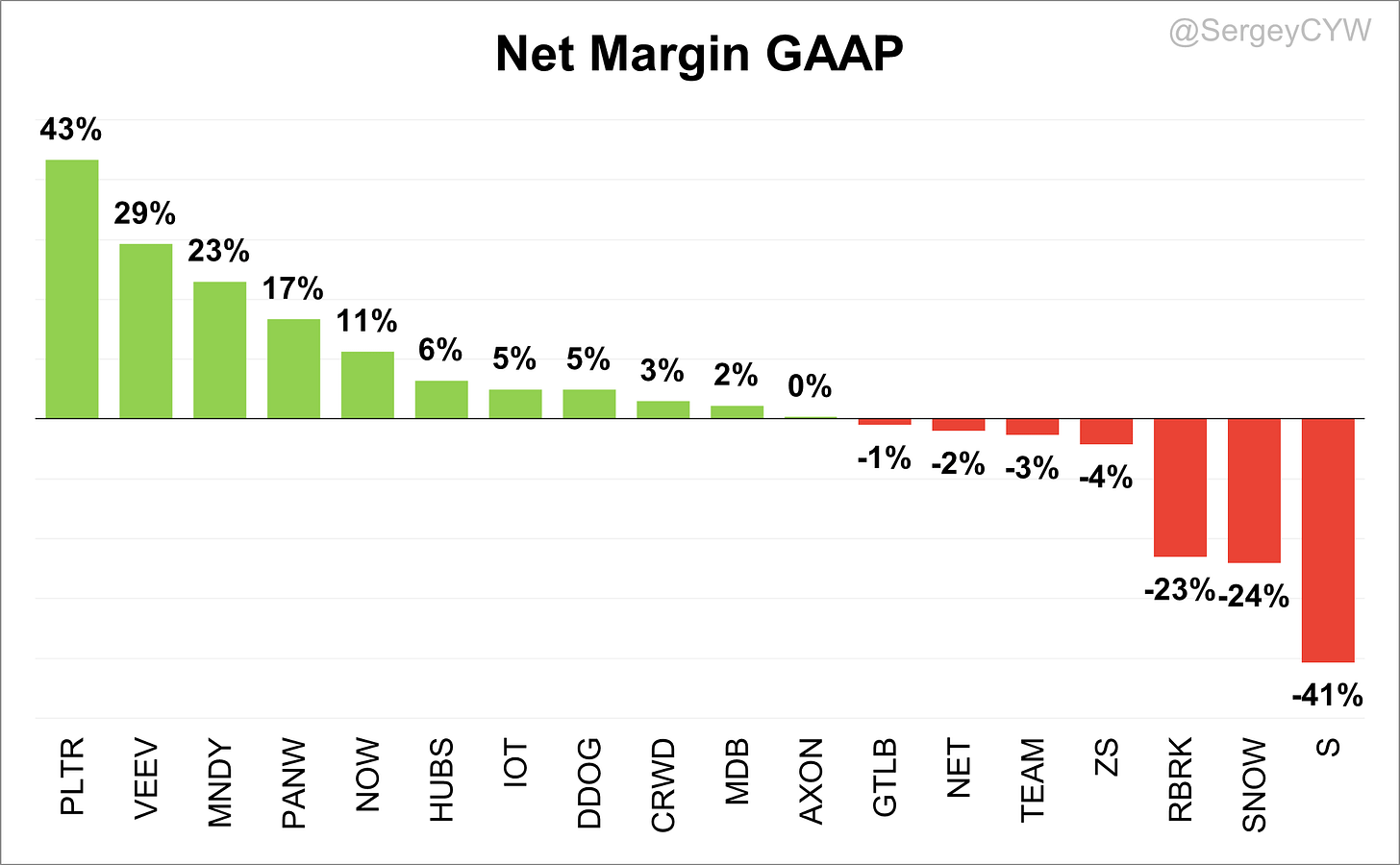 On the other side, $PLTR stands out with a strong 43% margin, and $VEEV shows solid profitability at 29%.
