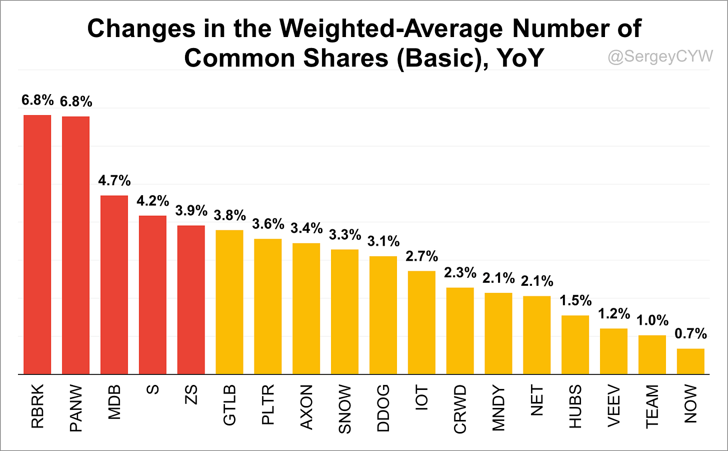 The most significant dilution occurred at $RBRK, and $PANW with an increase of +6.8%, followed by $MDB at +4.7%, $S at +4.2%, and $ZS at +3.9%—a level of dilution that raises serious concerns. Also showing elevated dilution were $GTLB, $PLTR, $AXON, $SNOW, and $DDOG above +3.0%.