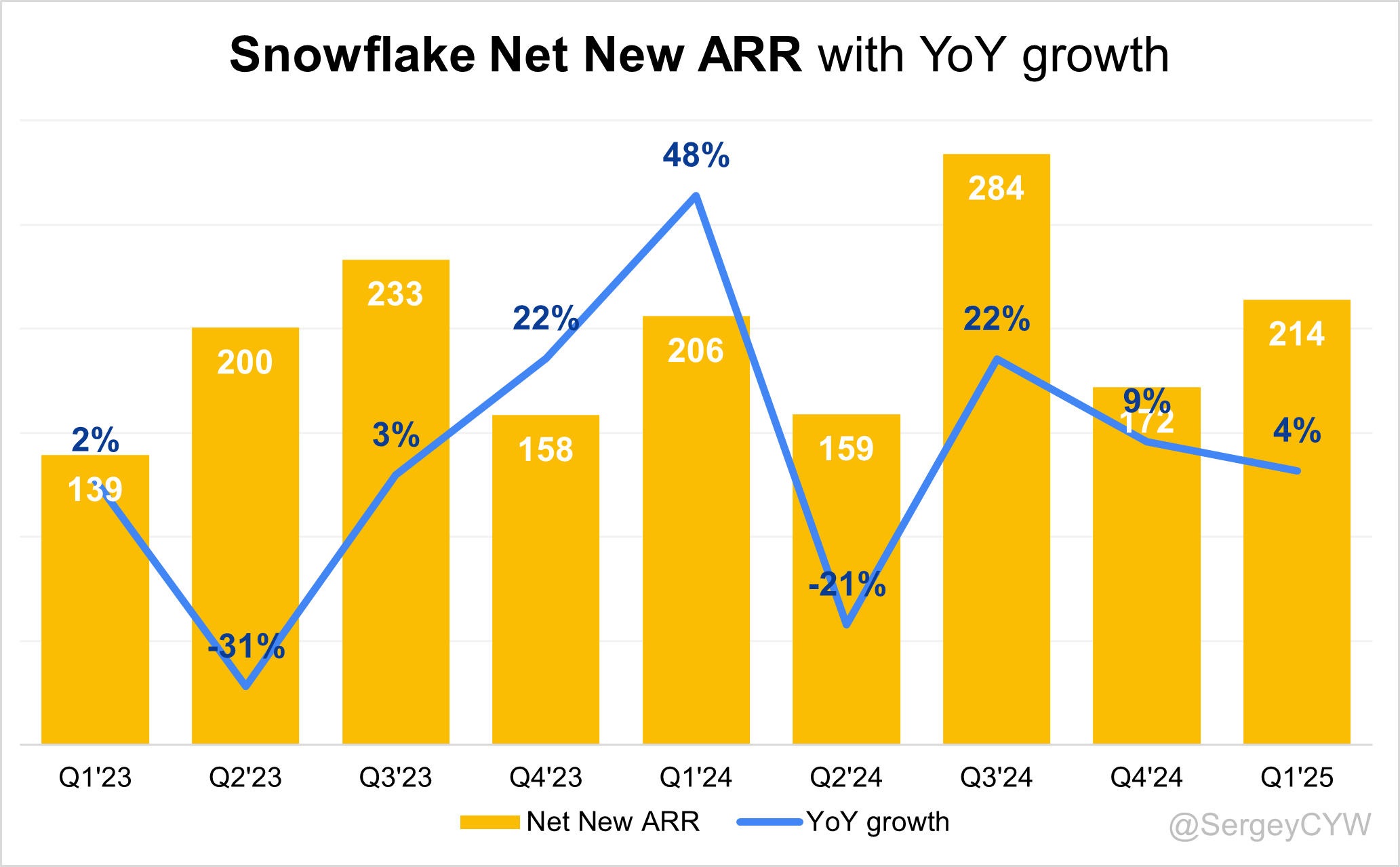 $SNOW Snowflake added $214 million in net new ARR, reflecting a +4% increase YoY.