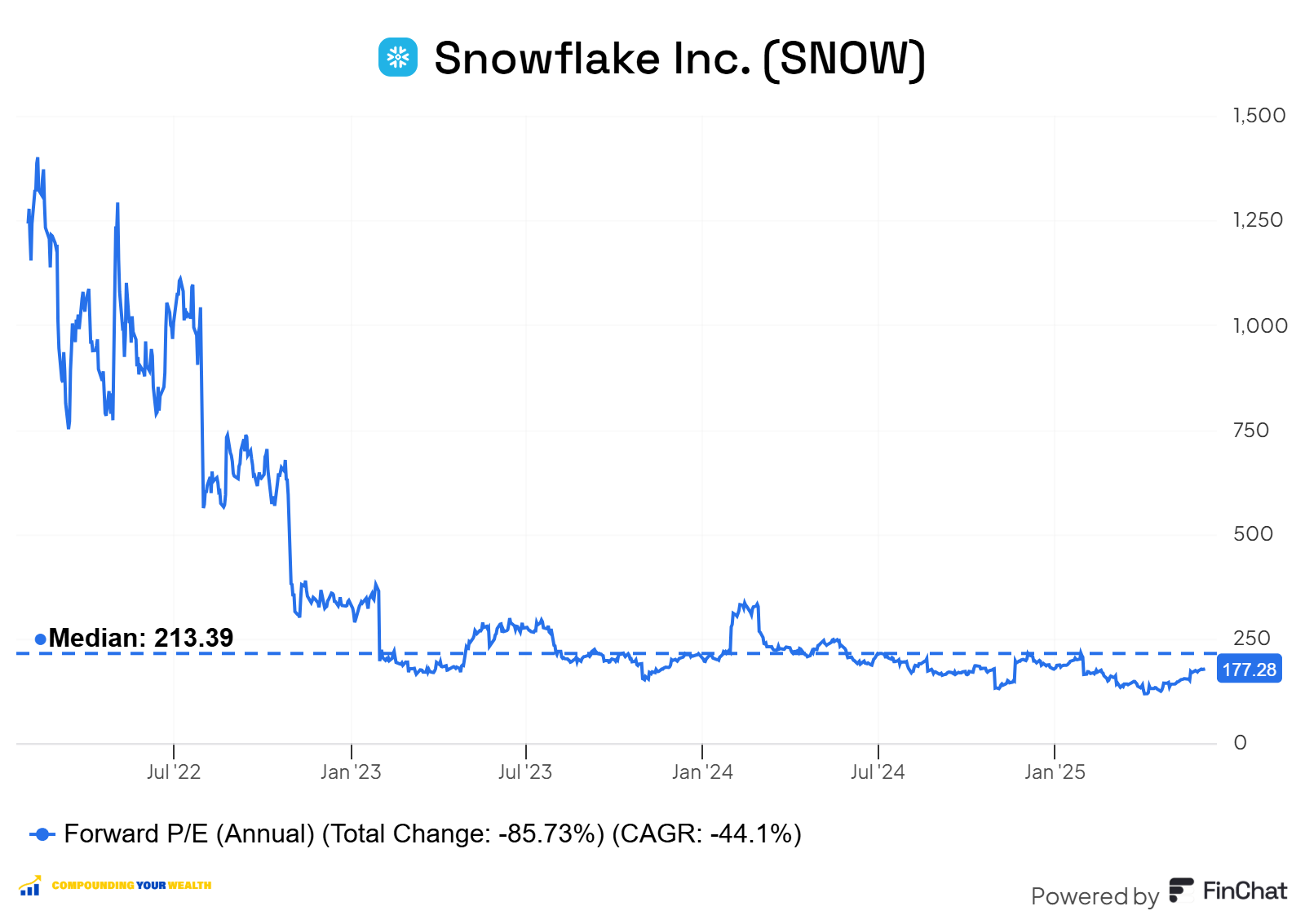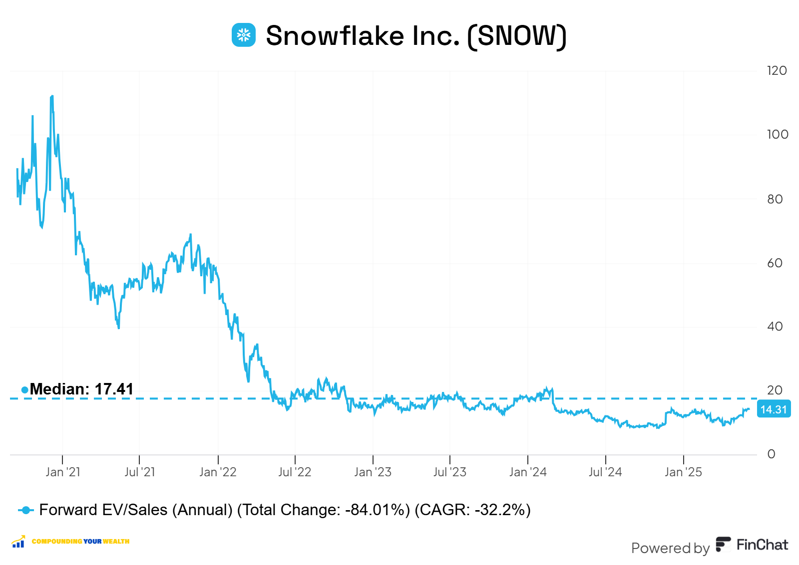 After a significant drop, $SNOW is trading at a Forward EV/Sales multiple of 14.3 —below 2022-2023 low levels and below the median of 17.4.