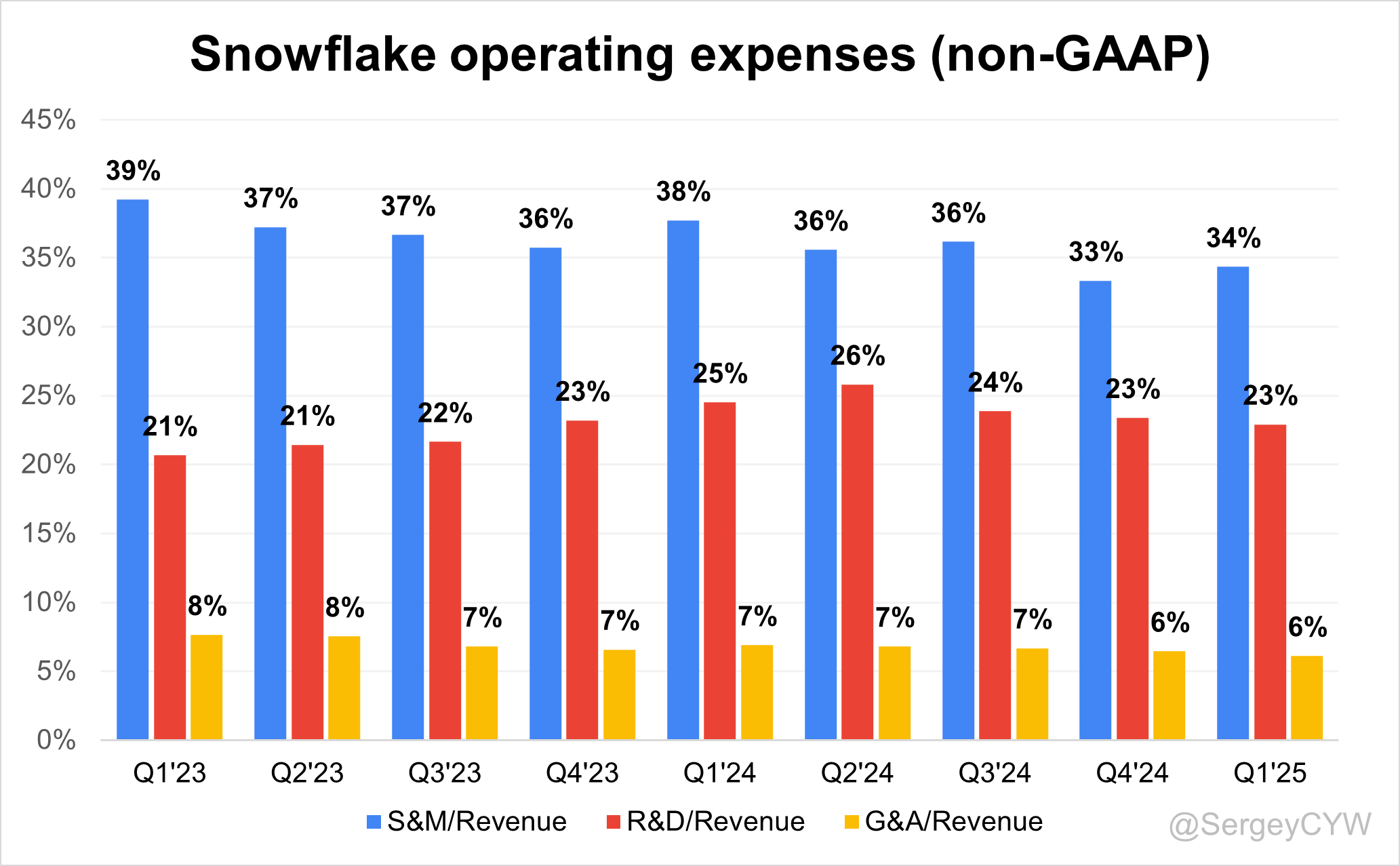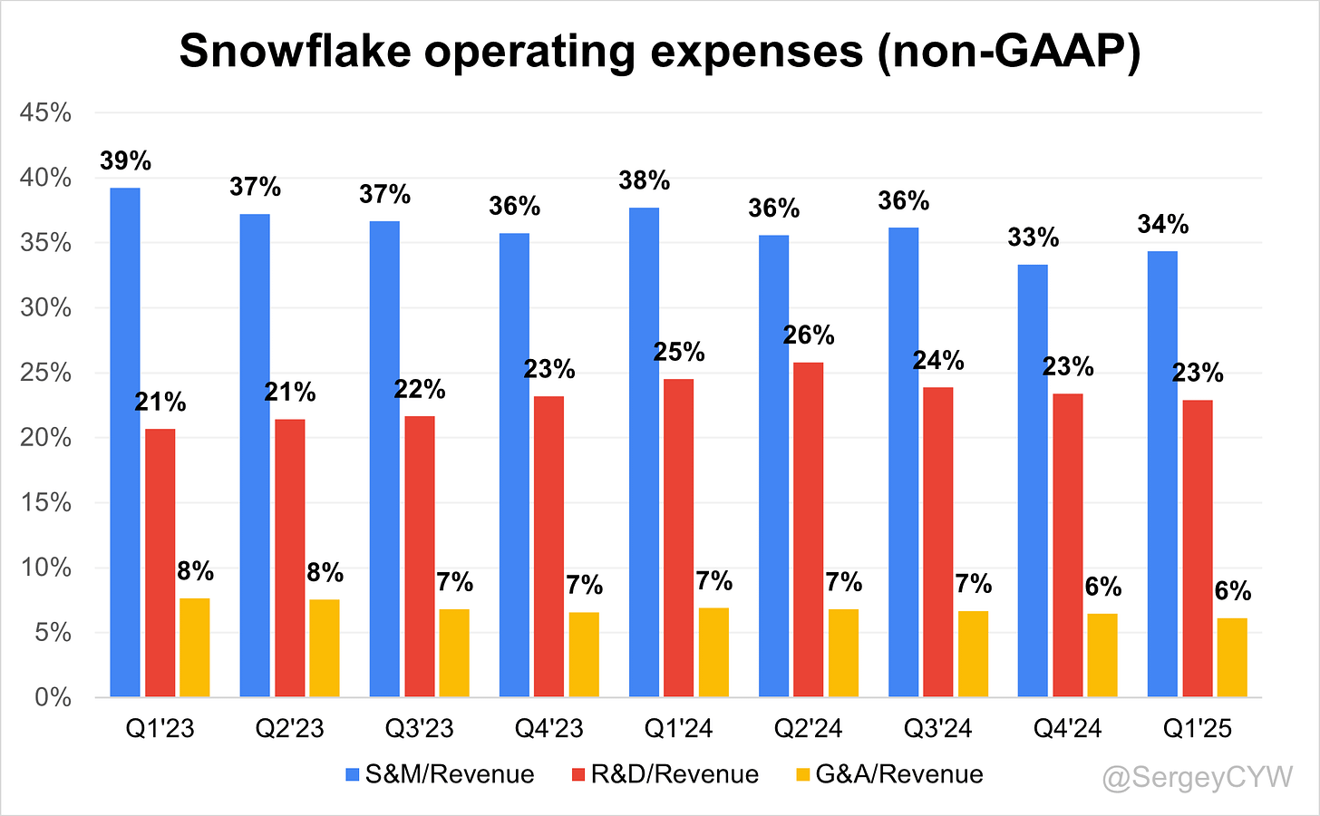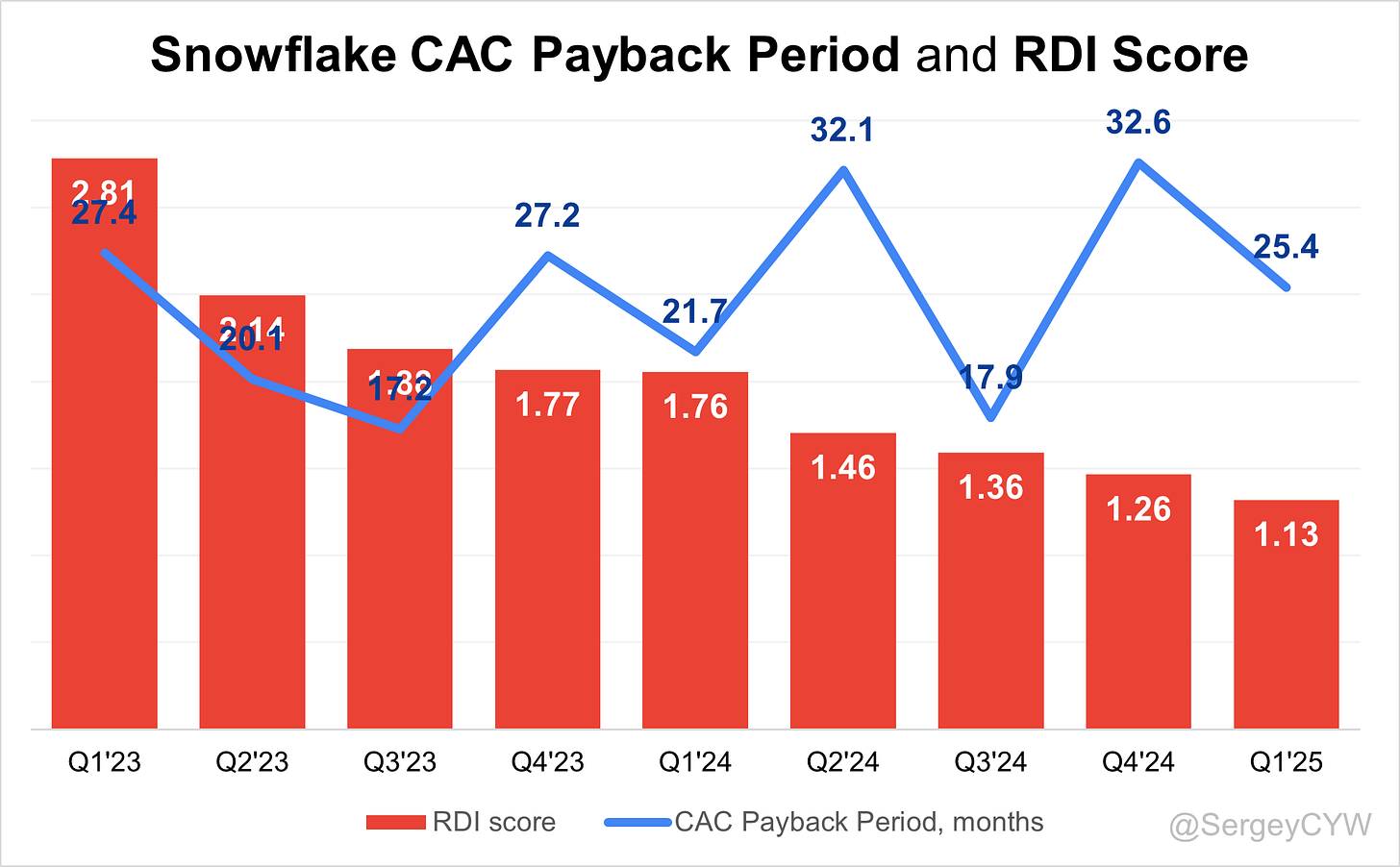 $SNOW Snowflake’s return on S&M spending is 25.4, an improvement compared to the previous quarter.