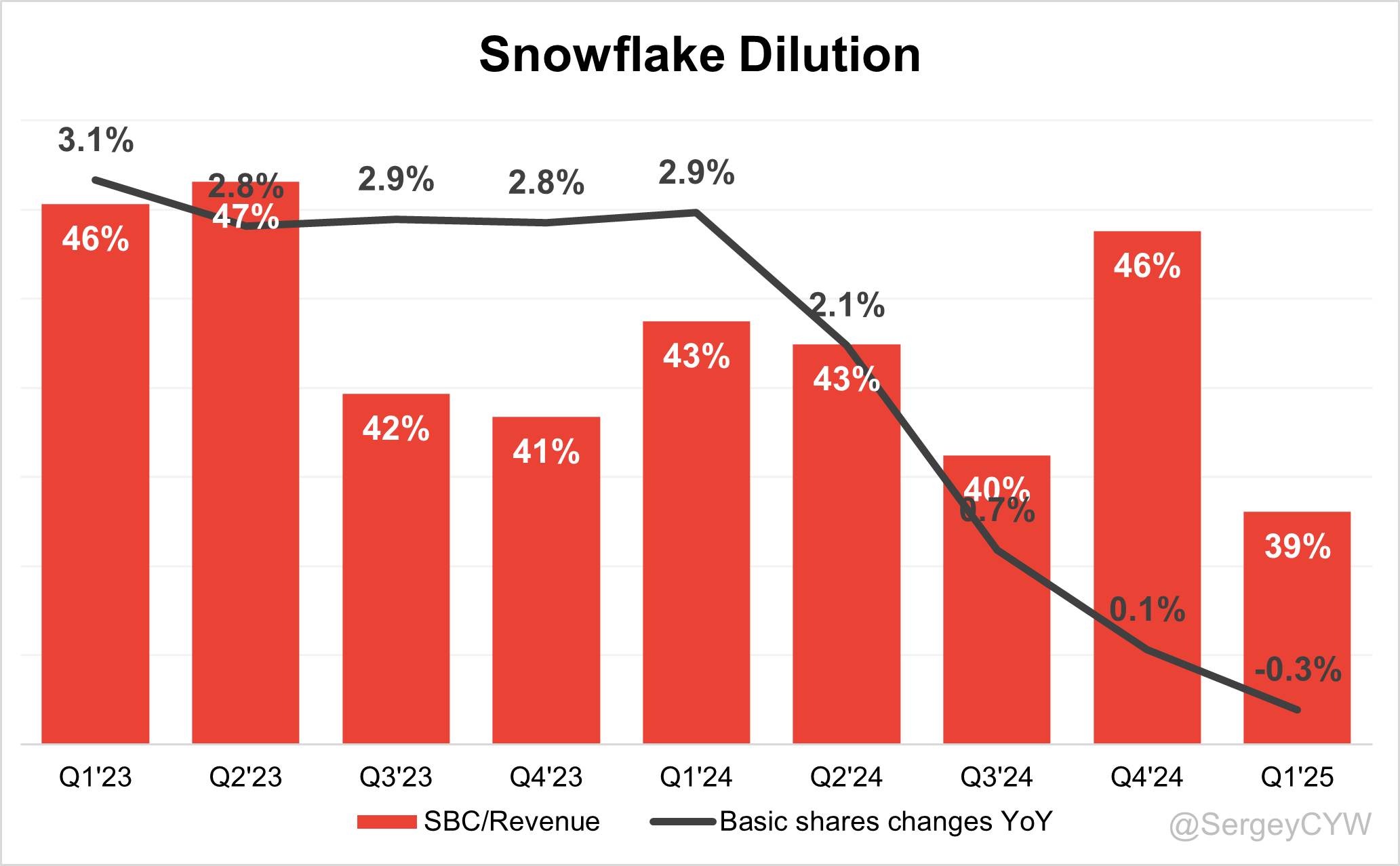 $SNOW Shareholder Dilution: Snowflake's stock-based compensation (SBC) expenses were previously at very high levels but declined in the last quarter to 39% of revenue, which is still relatively high.