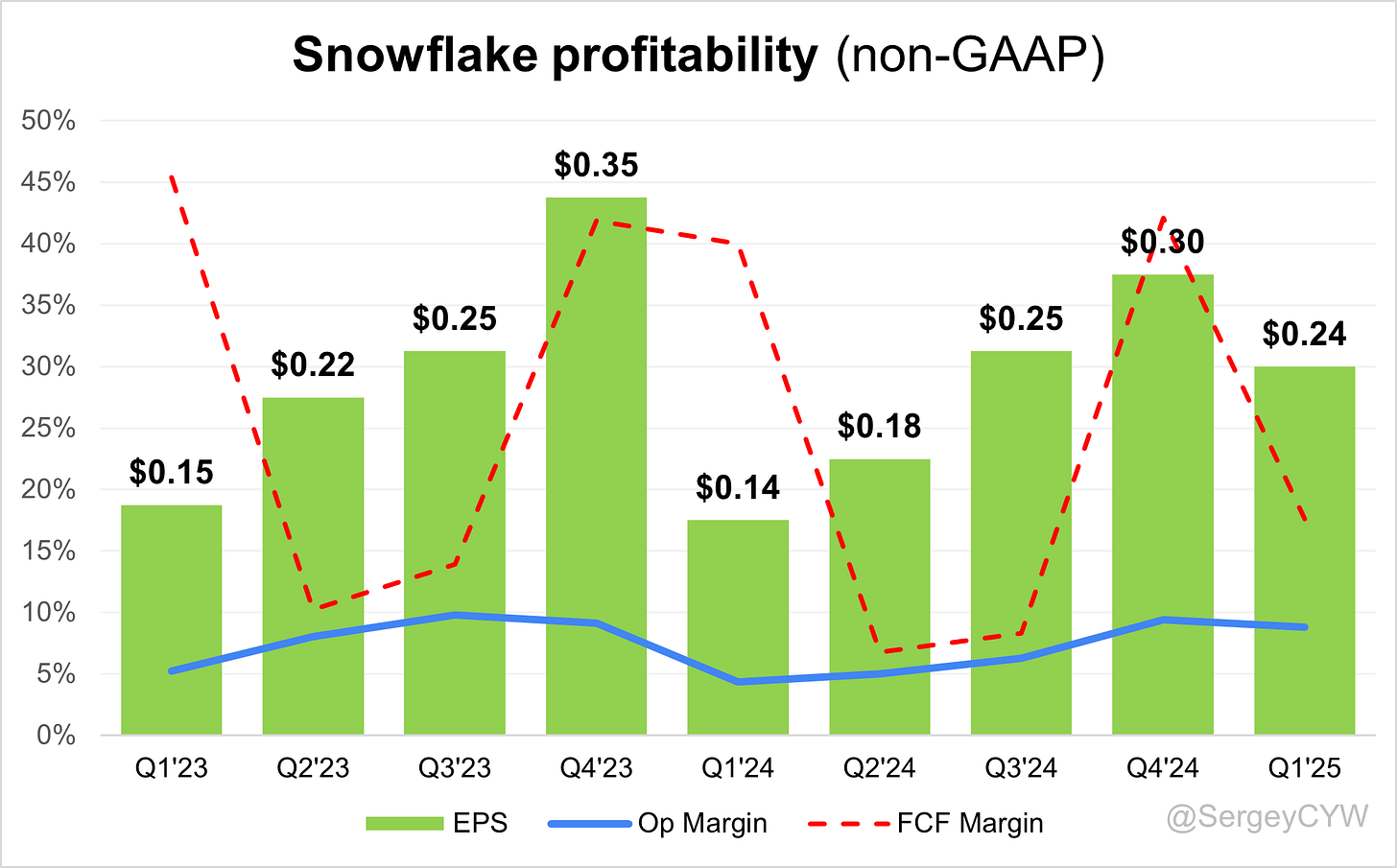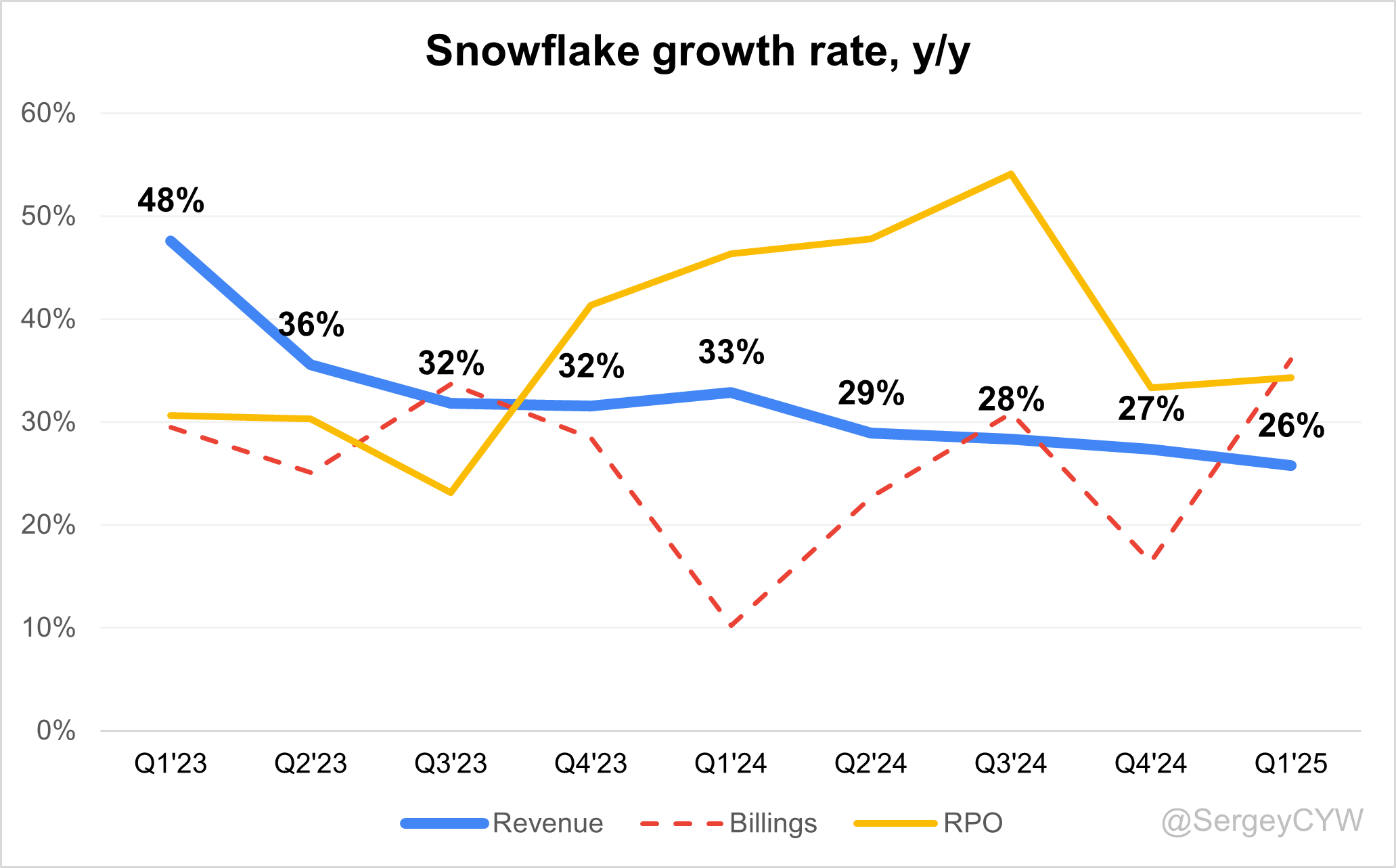 However, $SNOW Snowflake's revenue growth has slowed from an exceptional >100% YoY post-IPO to +26% in Q1 2025. This slowdown is broadly seen across the software sector, yet Snowflake remains one of the fastest-growing companies.