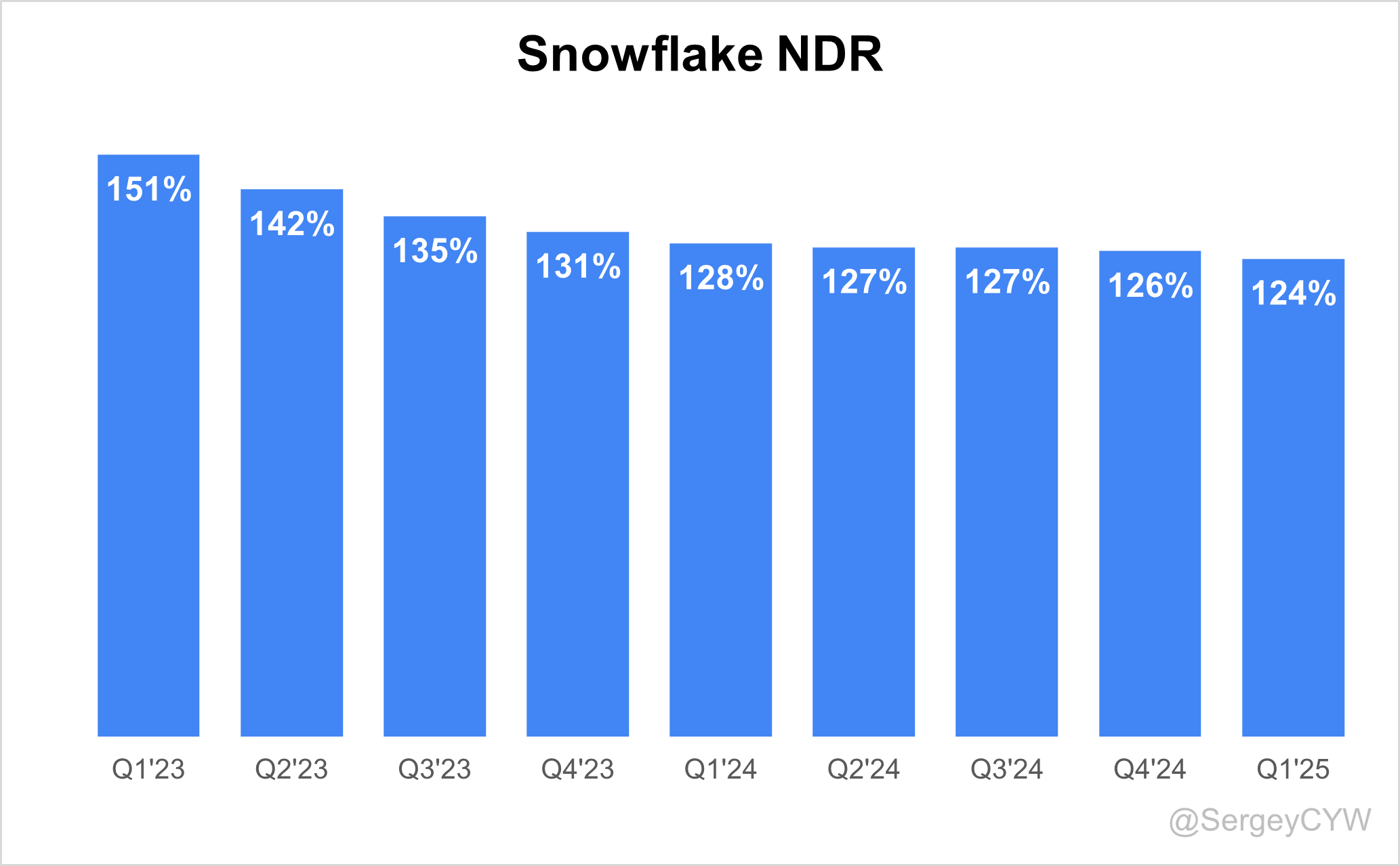 $SNOW Snowflake’s retention rate remains one of the highest in its class at 124% in Q1 2025, decreasing by 2 PP QoQ. The company calculates this metric based on data from the past two years, making it a lagging indicator for Snowflake.