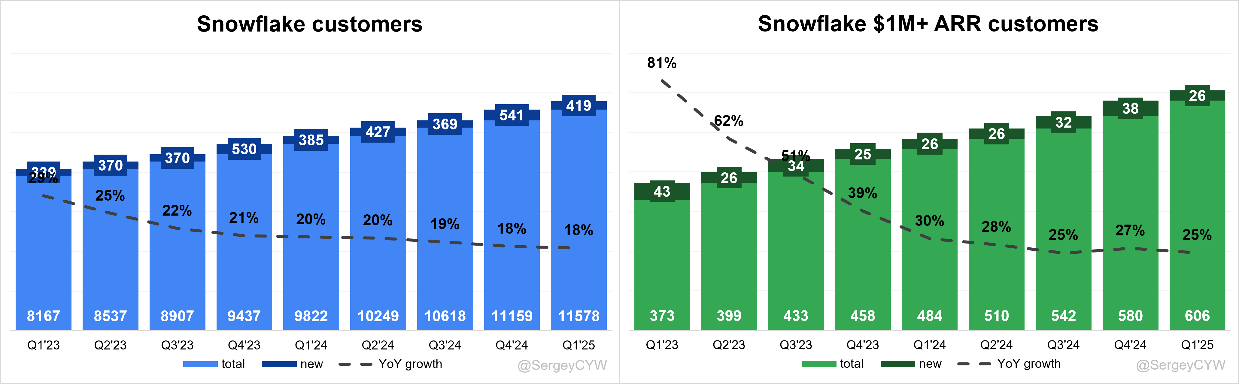 $SNOW Snowflake added 419 total customers, reflecting +18% YoY growth, which is higher than in Q1 last year. The company also added 26 large customers with $1M+ ARR, matching the level from Q1 2024, and achieved +25% YoY growth in that segment.