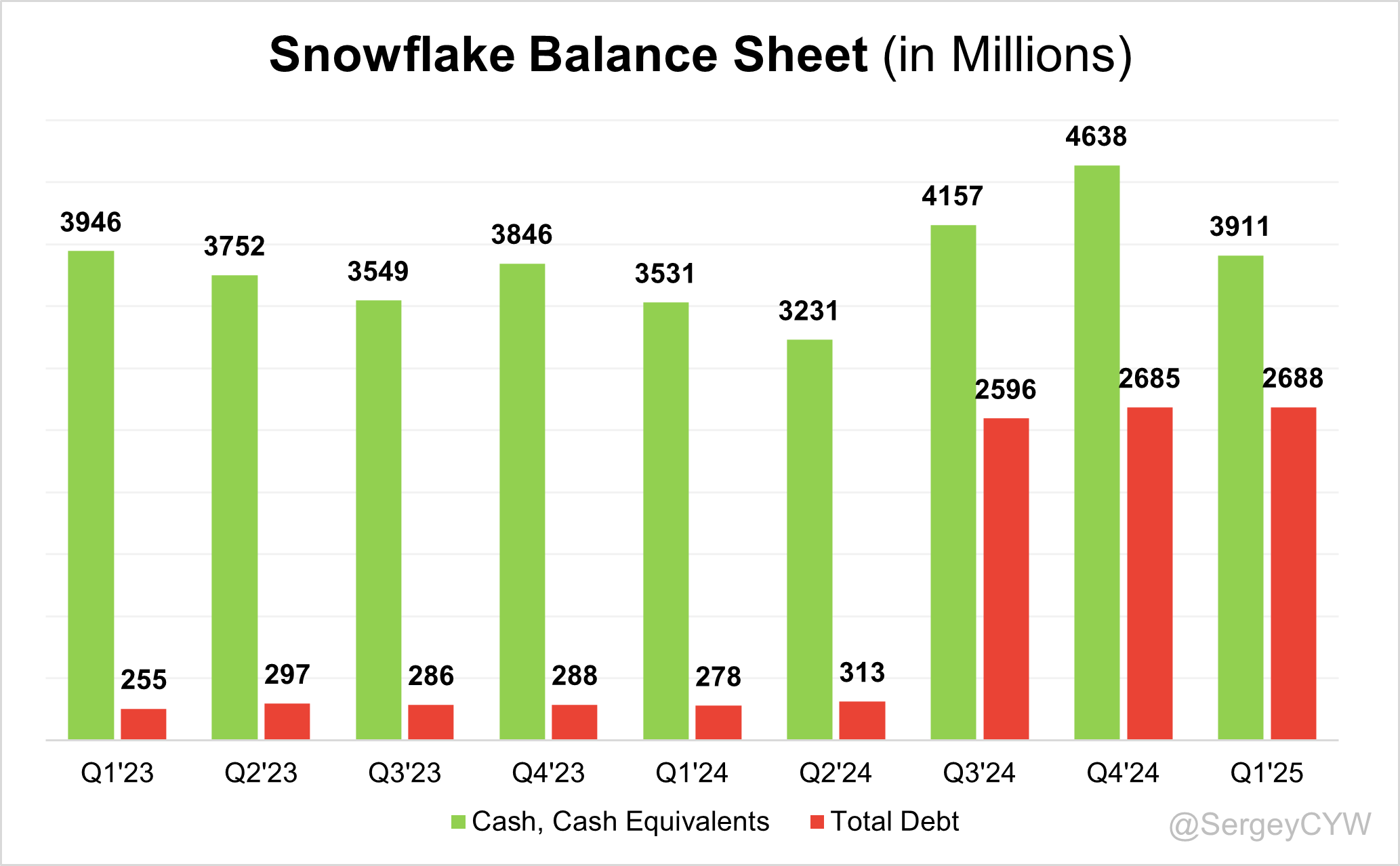 $SNOW Balance Sheet: Total debt stands at $2,688M. The company's debt increased in Q3 2024 due to the issuance of $2.3 billion in 0% convertible senior notes, split into $1.15 billion due in 2027 and $1.15 billion due in 2029. However, Snowflake holds $3,911M in cash and cash equivalents, keeping the balance sheet stable.