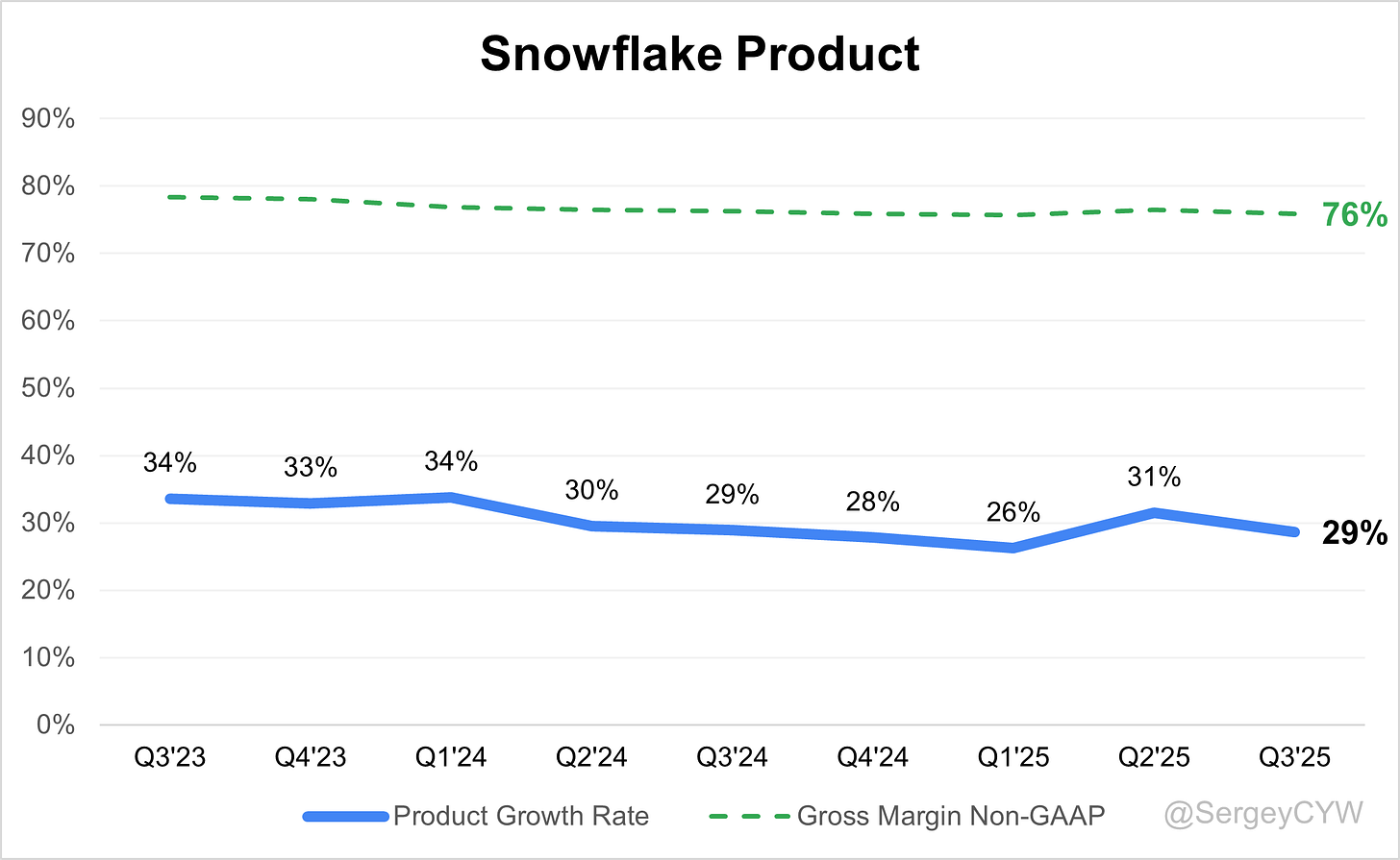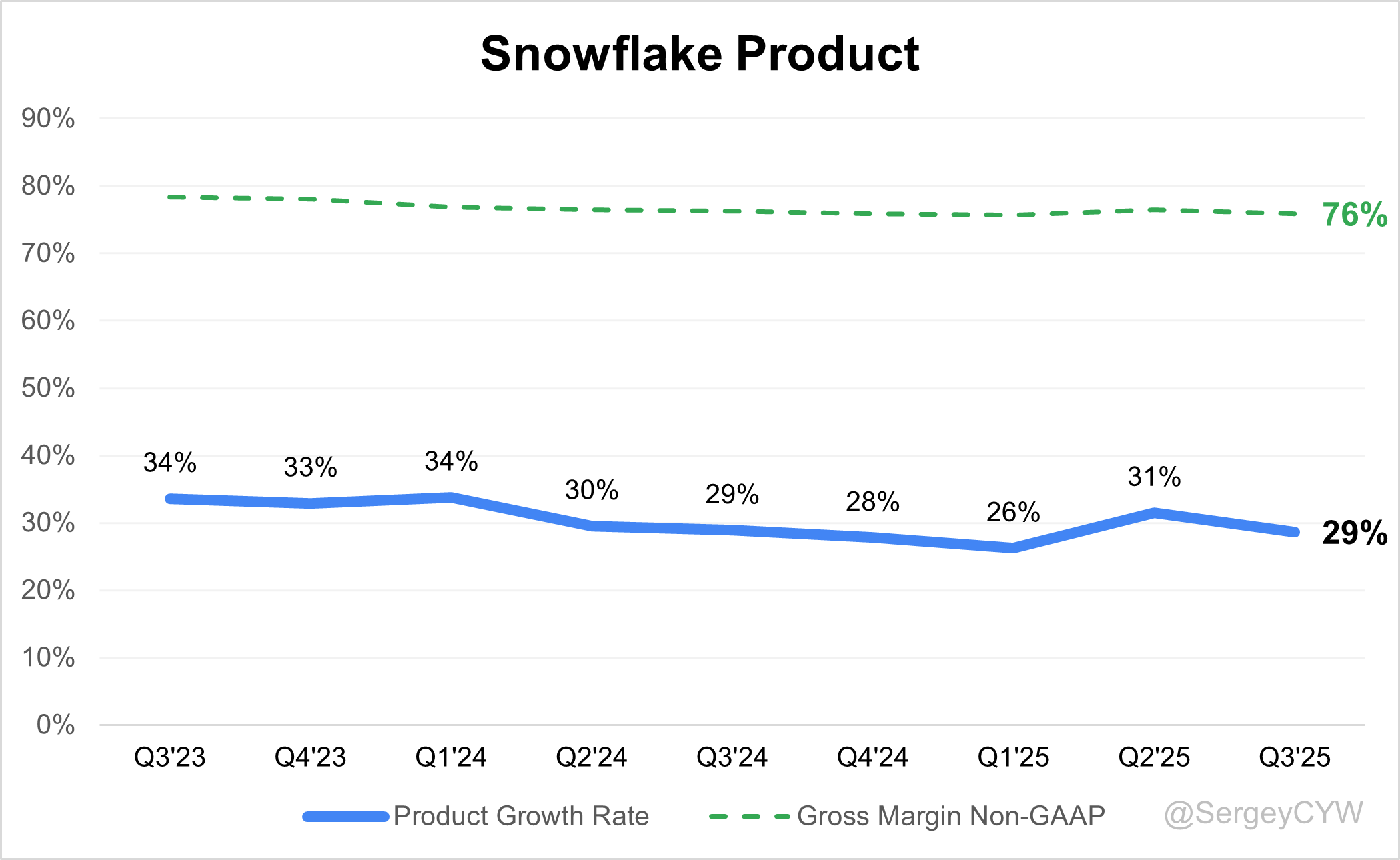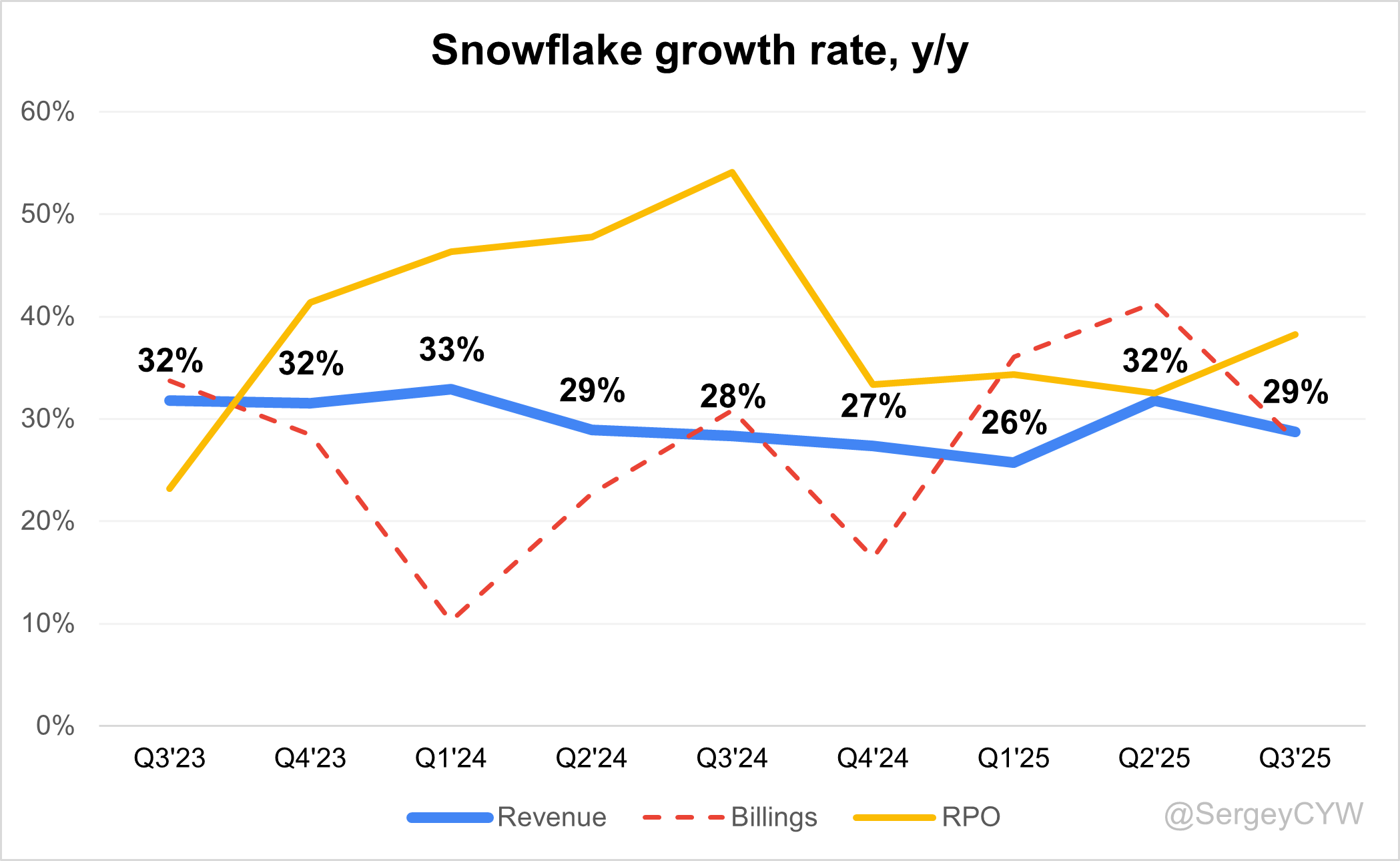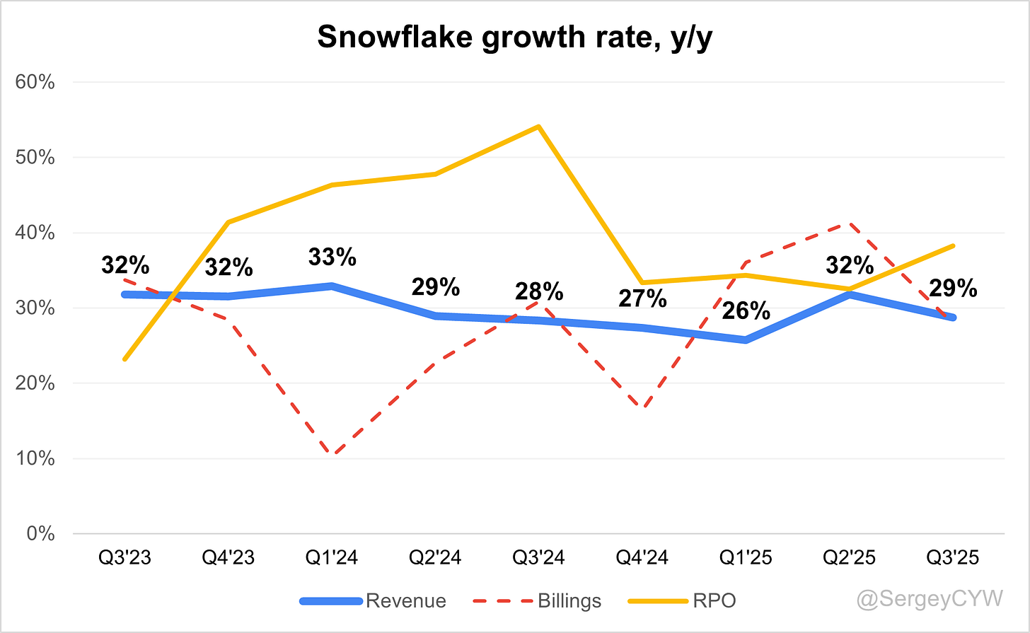 Snowflake reported 29% YoY product revenue growth to $1.16B in Q3 and raised its full-year forecast to $4.446B, implying 28% annual growth. Remaining Performance Obligations rose 37% YoY to $7.88B, showing stronger multi-year commitments. Gross margin reached 75.9%, while operating margin expanded 450 bps YoY to 11%, reflecting improved efficiency despite earlier sales and marketing investments. Free cash flow margin stood at 11%. The company ended the quarter with $4.4B in liquidity after repurchasing $233M in stock. A brief $1–2M revenue impact came from a hyperscaler outage, but consumption trends stayed aligned with internal expectations.
