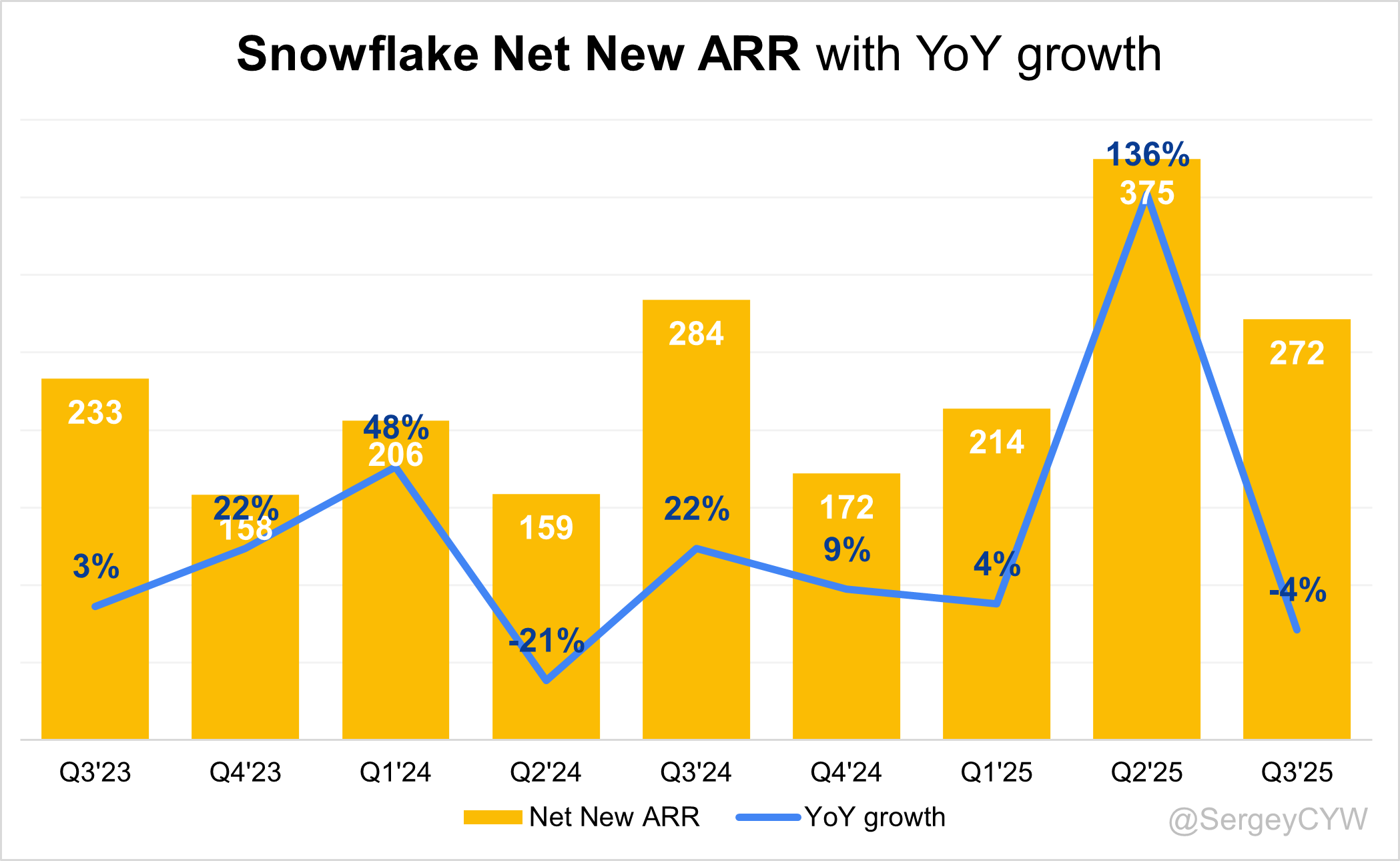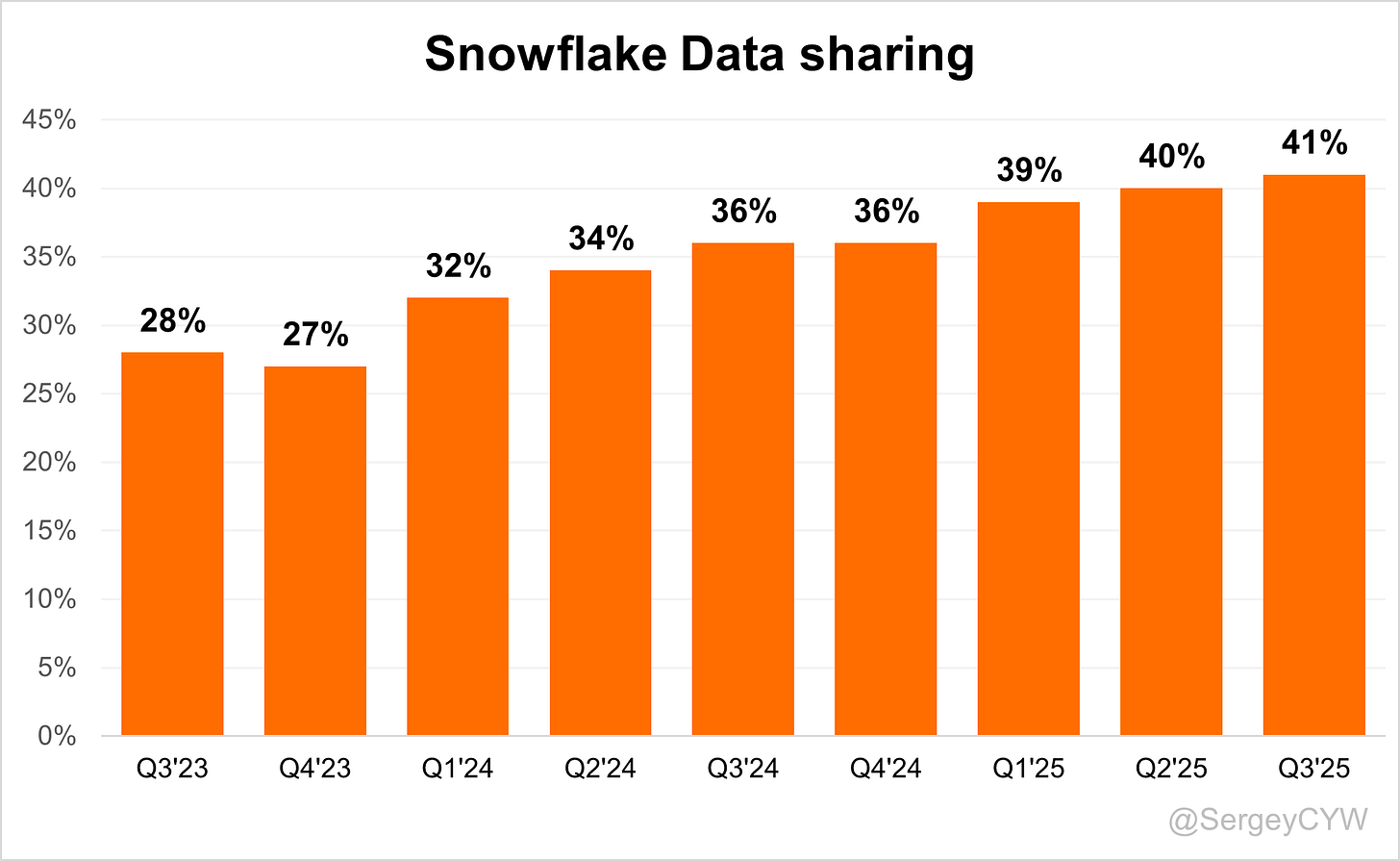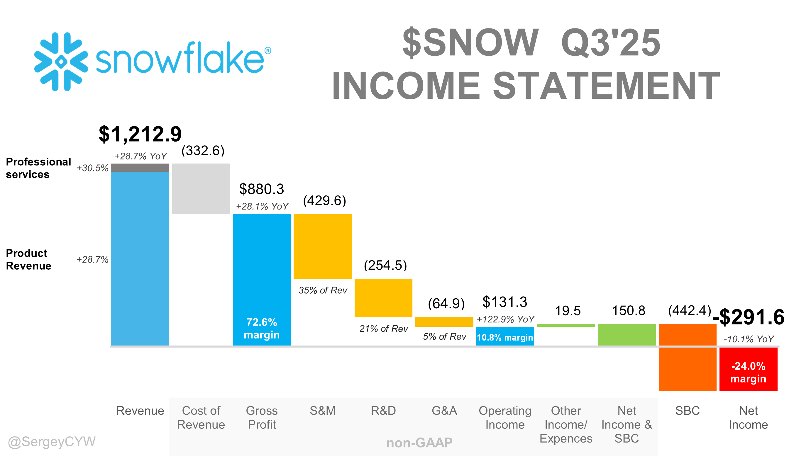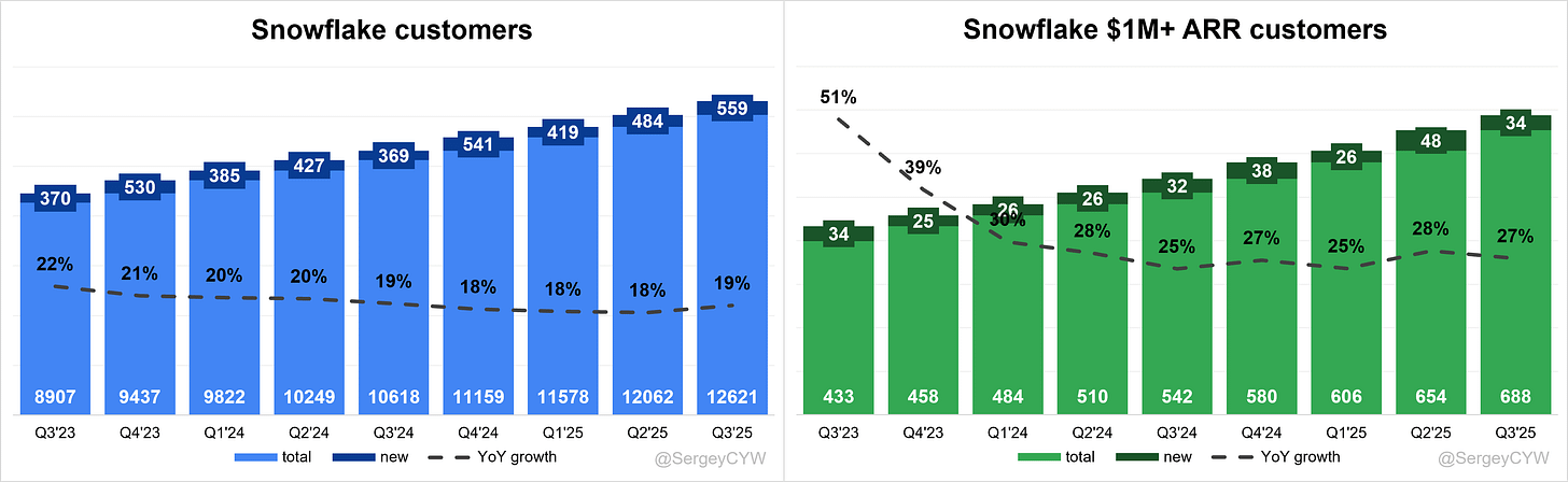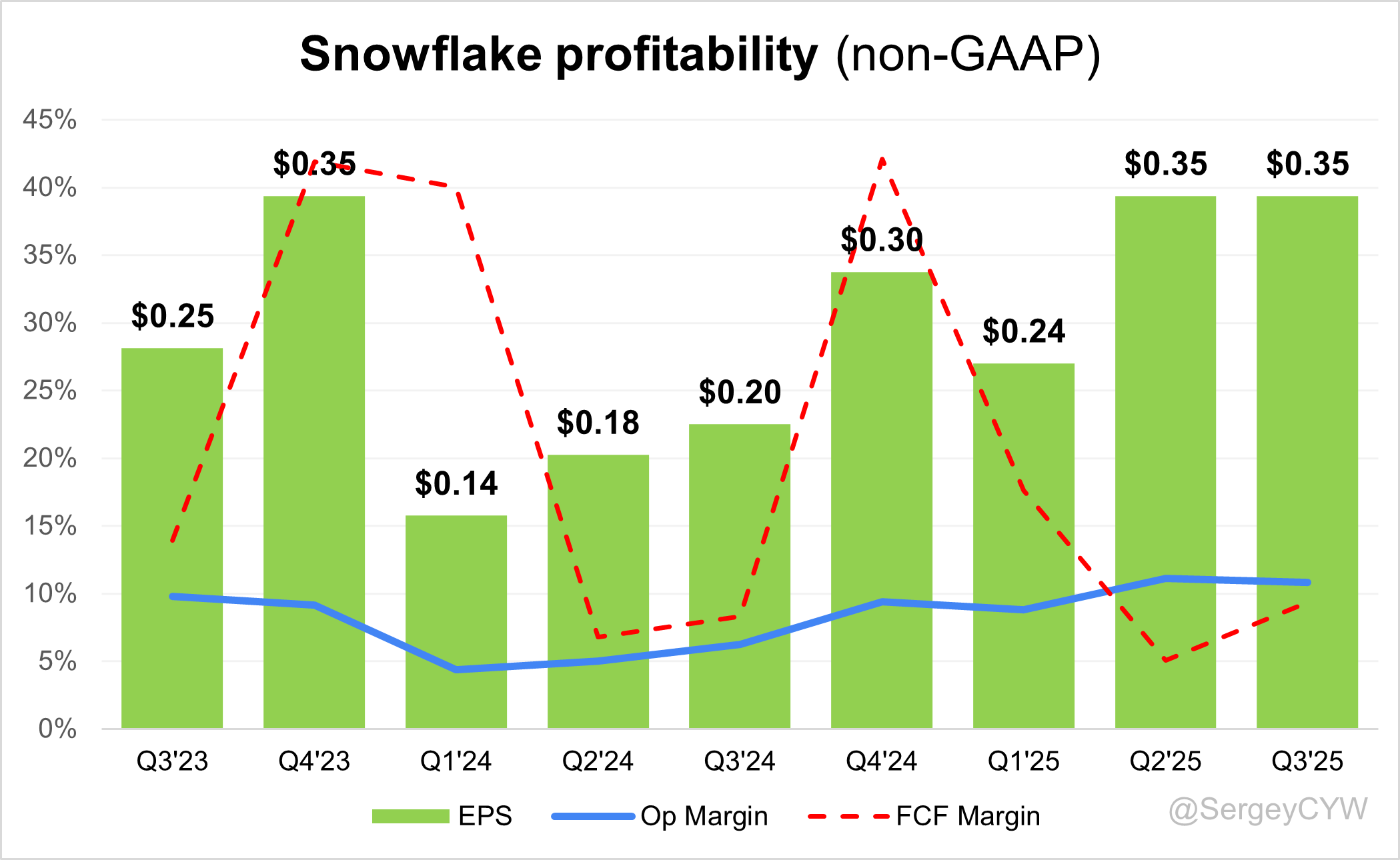 Snowflake reported 29% YoY product revenue growth to $1.16B in Q3 and raised its full-year forecast to $4.446B, implying 28% annual growth. Remaining Performance Obligations rose 37% YoY to $7.88B, showing stronger multi-year commitments. Gross margin reached 75.9%, while operating margin expanded 450 bps YoY to 11%, reflecting improved efficiency despite earlier sales and marketing investments. Free cash flow margin stood at 11%. The company ended the quarter with $4.4B in liquidity after repurchasing $233M in stock. A brief $1–2M revenue impact came from a hyperscaler outage, but consumption trends stayed aligned with internal expectations.
