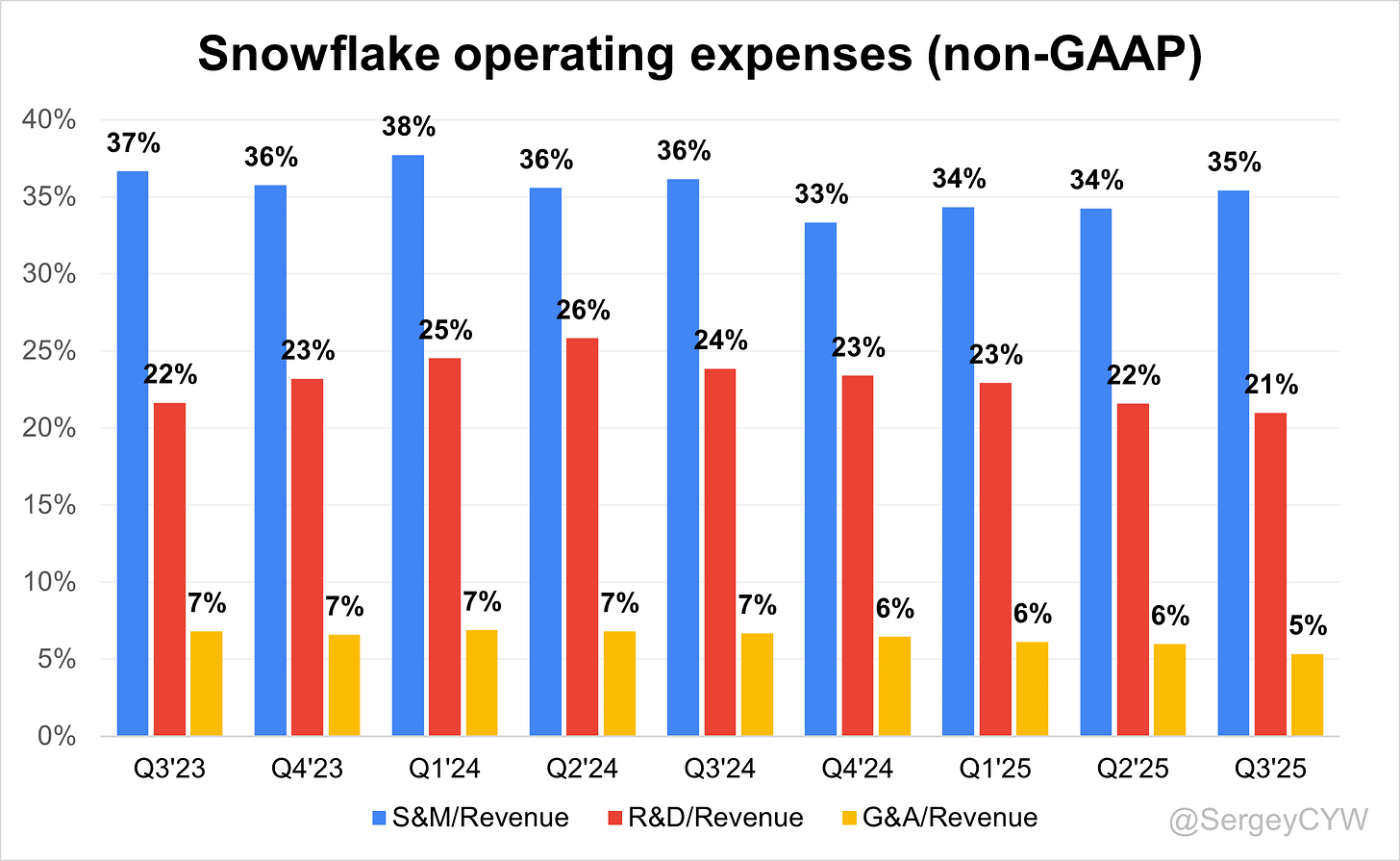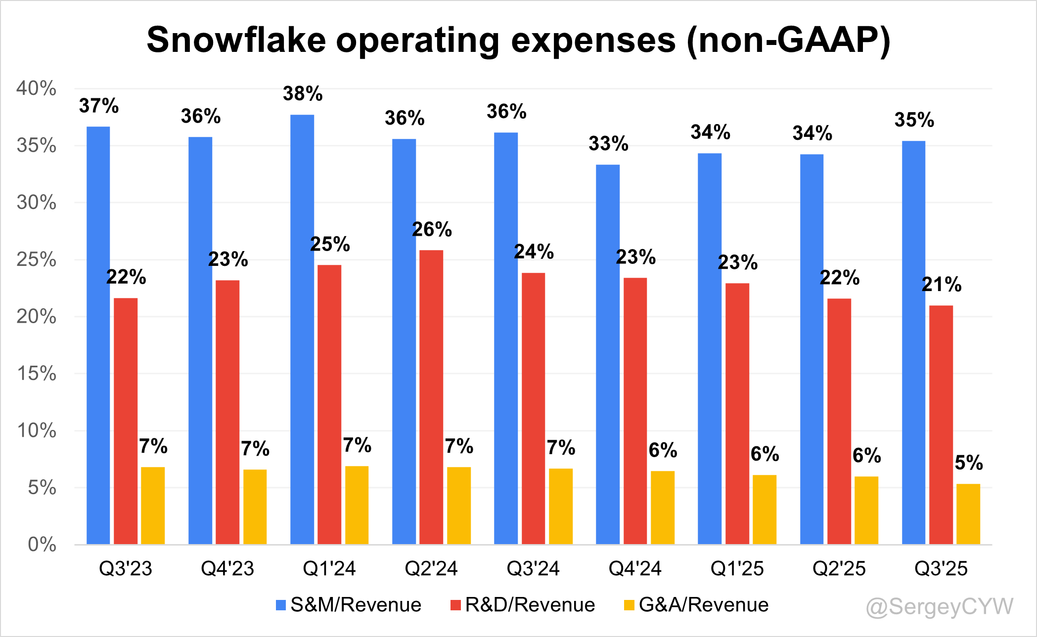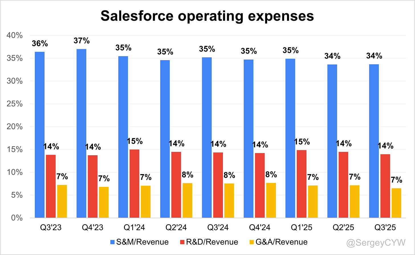 S&M spend dropped to 33.7% of revenue (-1.5 pps YoY), while R&D (14.0%) and G&A (6.5%) were slightly lower.