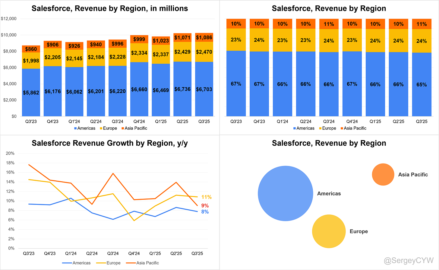 Americas revenue rose +7.8% YoY, Europe +10.9%, APAC +9.0%, with the region contributing 10.6% of total revenue.