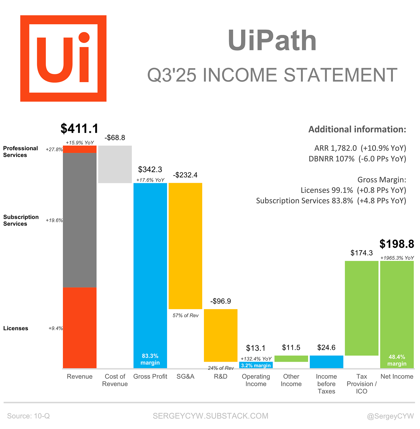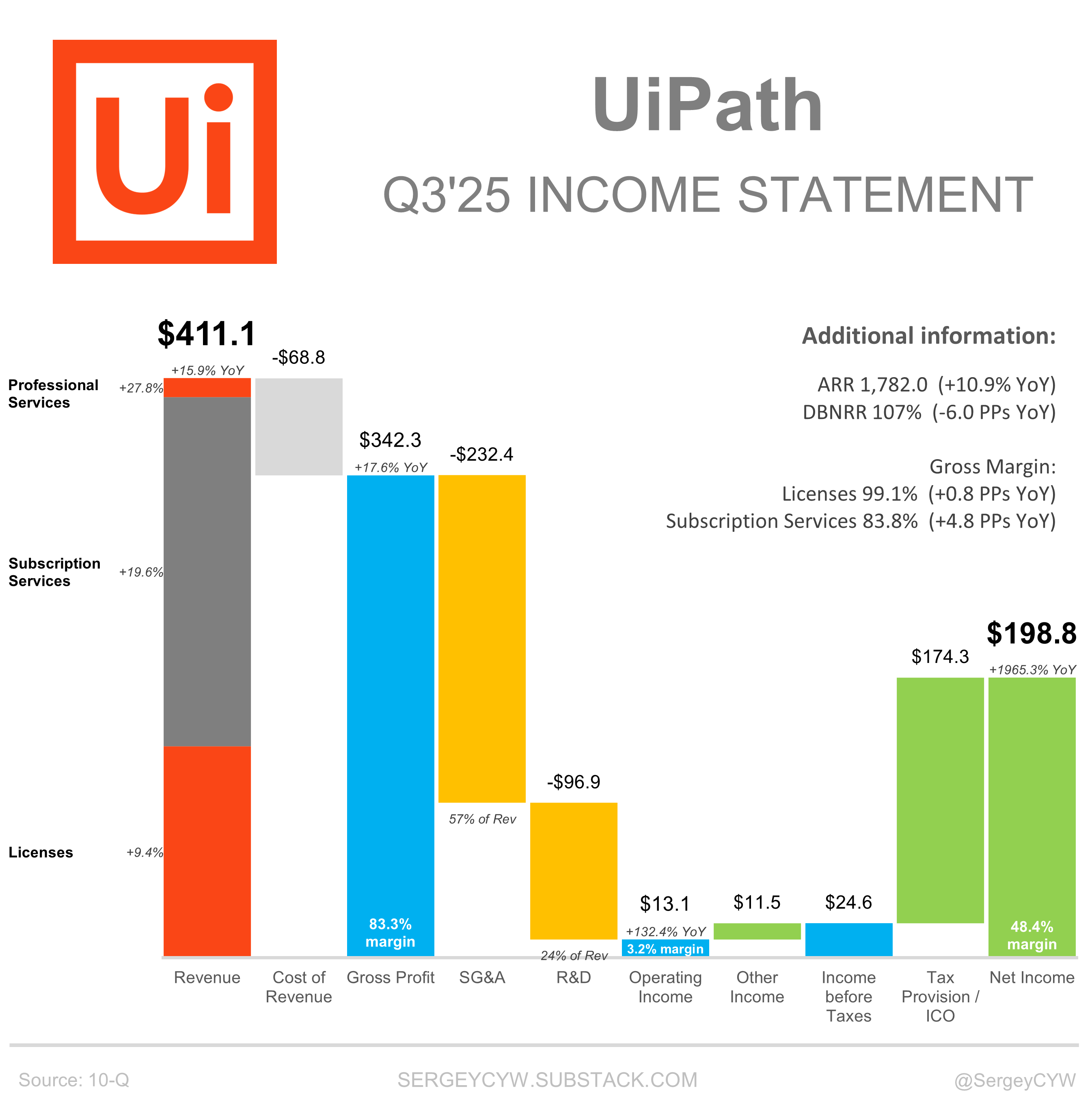 UiPath’s Q3 FY26 showed meaningful progress across revenue, margins, and profitability. Revenue grew 16% YoY to $411M, beating estimates. Gross margin expanded to 85%, while operating margin hit 3%—a 14.5-point jump YoY. The company also reported its first GAAP-profitable third quarter, with net income soaring nearly 20x to $199M. Non-GAAP operating margin reached 21%, reflecting strong cost discipline and leverage.