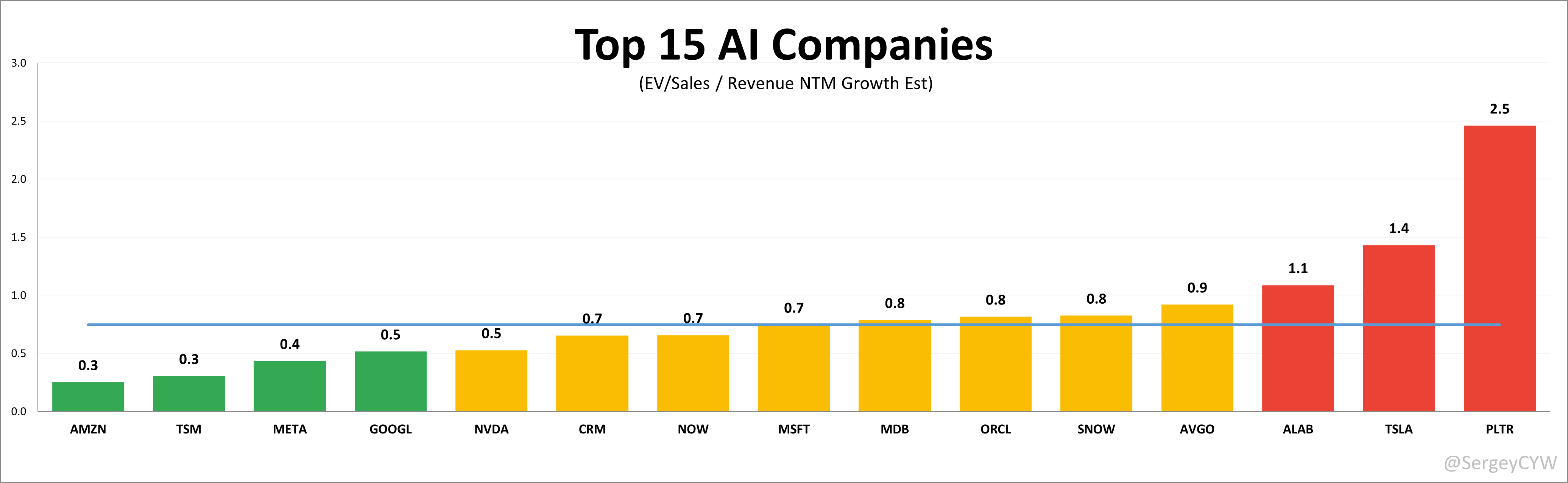 PLTR, NVDA, TSM, META, and AMZN trade below peer averages, signaling value in scaled growth.