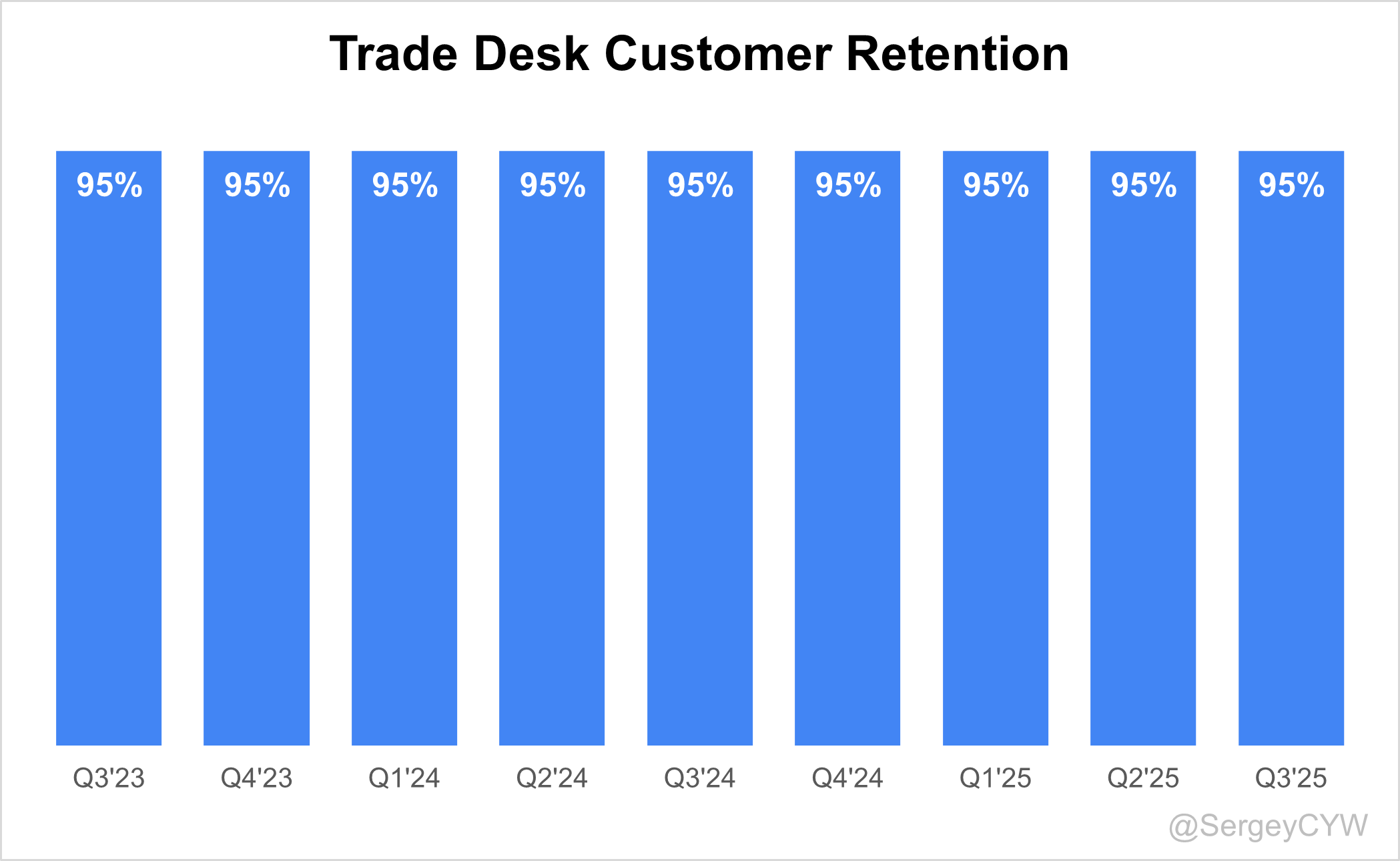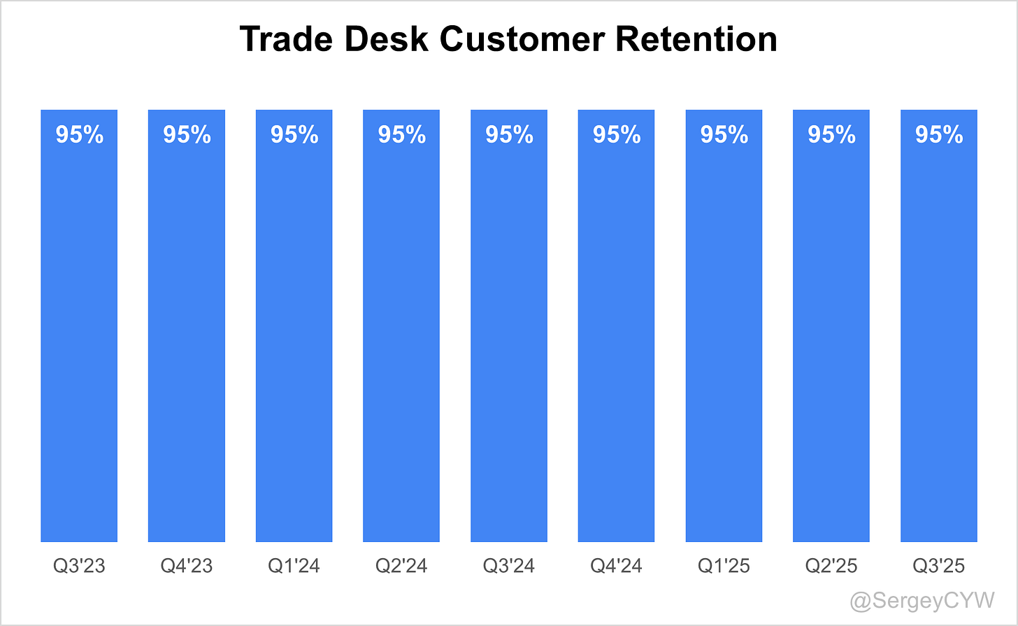 $TTD's Customer Retention Rate has remained high for a long time, consistently above 95%.