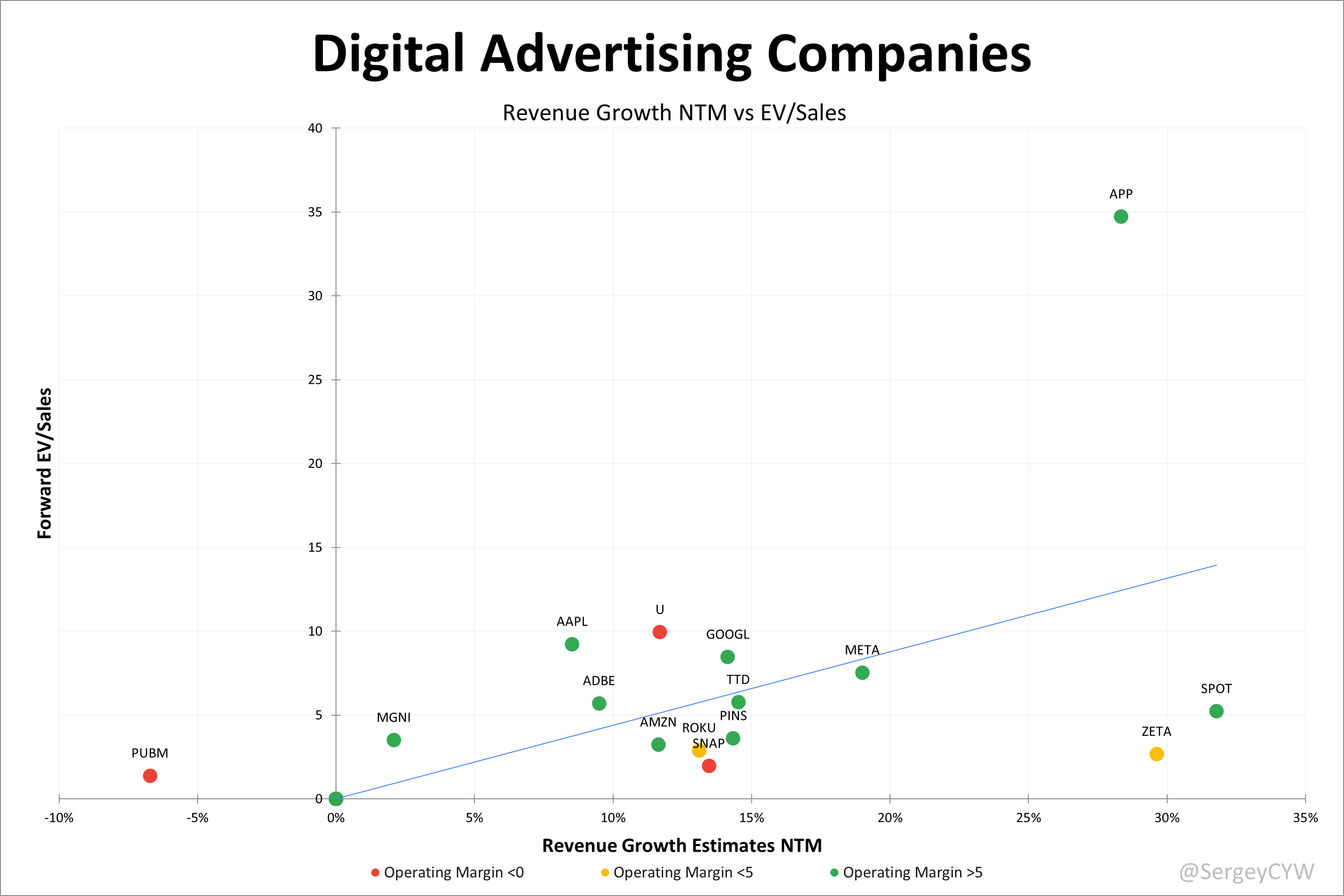 Analysts forecast $TTD's NTM revenue growth at +14.5%. Based on these projections, The Trade Desk is fair valued on an EV/Sales basis relative to other digital advertising companies.
