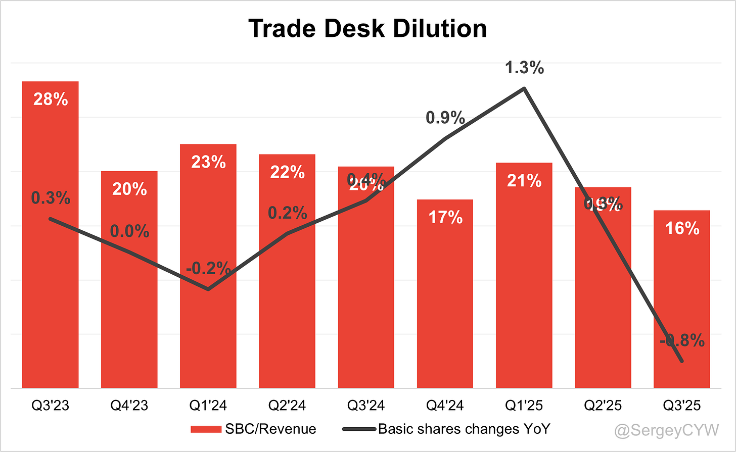 $TTD Shareholder Dilution: The Trade Desk’s stock-based compensation (SBC) expenses declined over the past year to 16% of revenue, which is in line with the SaaS company average.