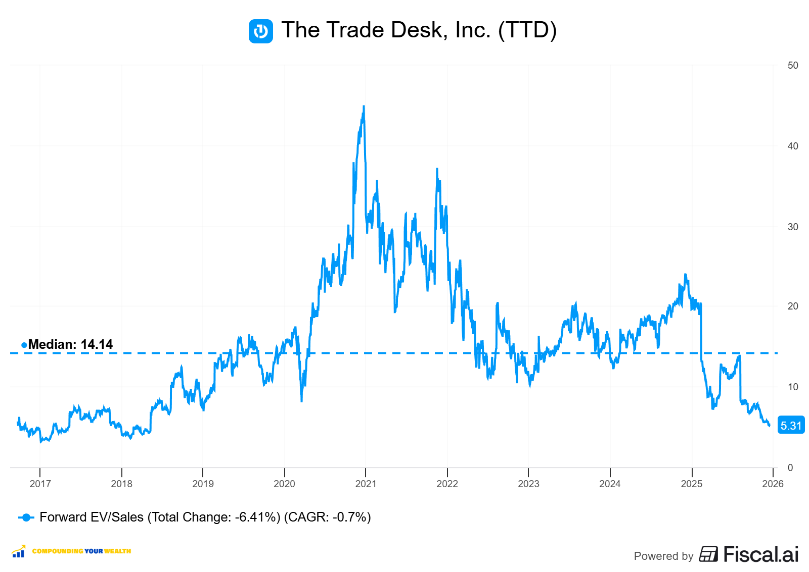 $TTD The Trade Desk is currently trading at a forward EV/Sales multiple of 5.3, which is below its median of 14.1, and near the histirical lows.