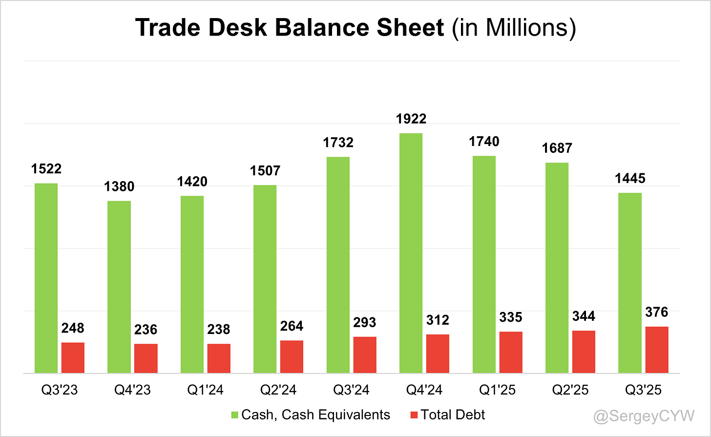 $TTD Balance Sheet: Total debt stands at $376M, while The Trade Desk holds $1,445M in cash and cash equivalents, exceeding total debt and ensuring a healthy balance sheet.