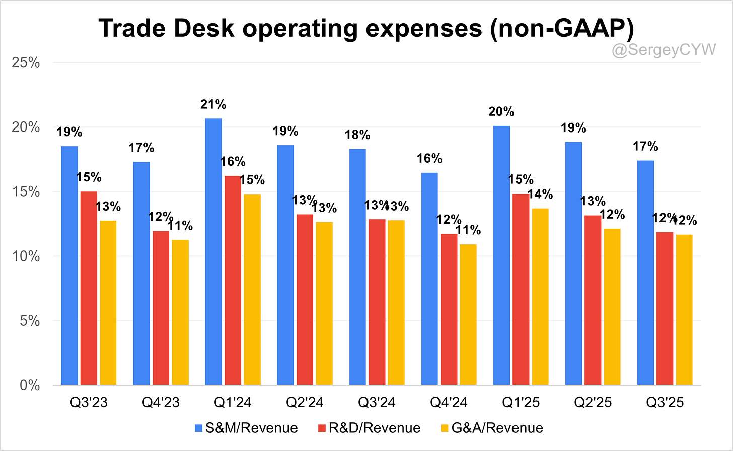 $TTD The Trade Desk's non-GAAP operating expenses have decreased, driven by reductions in S&M, R&D, and G&A spending.