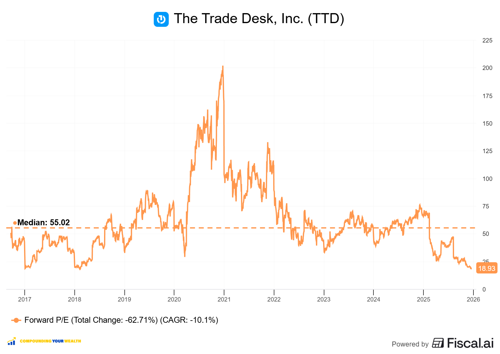 $TTD shares are down 73.2% from their 52-week high, sharply compressing valuation multiples. The stock now trades near historical lows and appears undervalued relative to other digital advertising companies, as well as to software companies more broadly, given expected revenue growth.