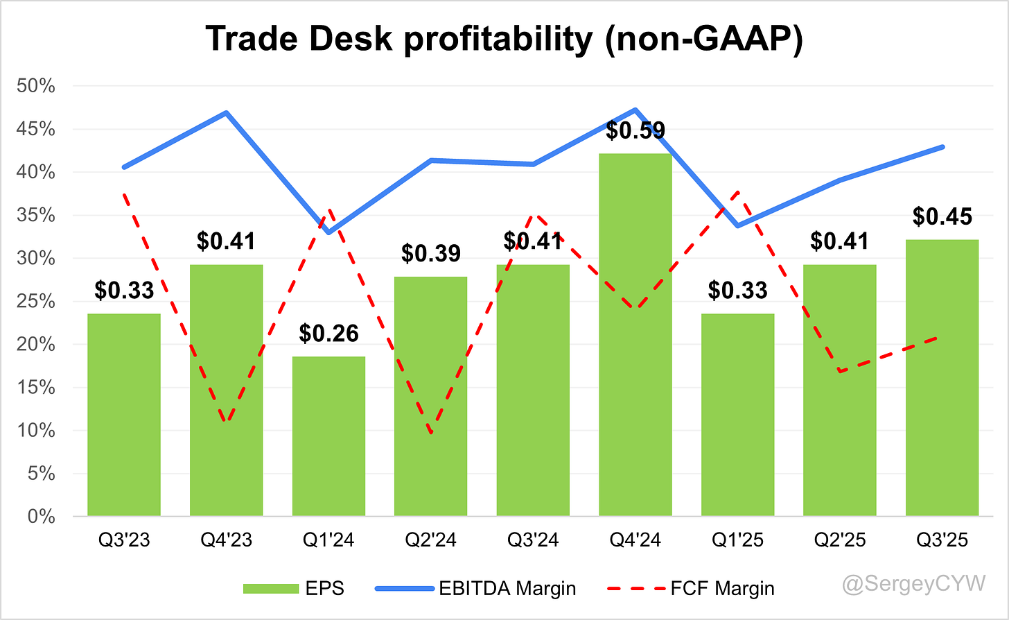Q3 was not particularly impressive for The Trade Desk at first glance. Revenue growth came in at +17.7%, down from +27.4% in Q3 2024. Based on management’s guidance for the next quarter, if the company were to beat its forecast by a similar margin (+3.1%), reported growth would be around +16.8%, implying further deceleration. Revenue growth is slowing, free cash flow margin declined, and valuation sits roughly in line with the digital advertising sector, given NTM revenue growth of ~14.5% YoY.