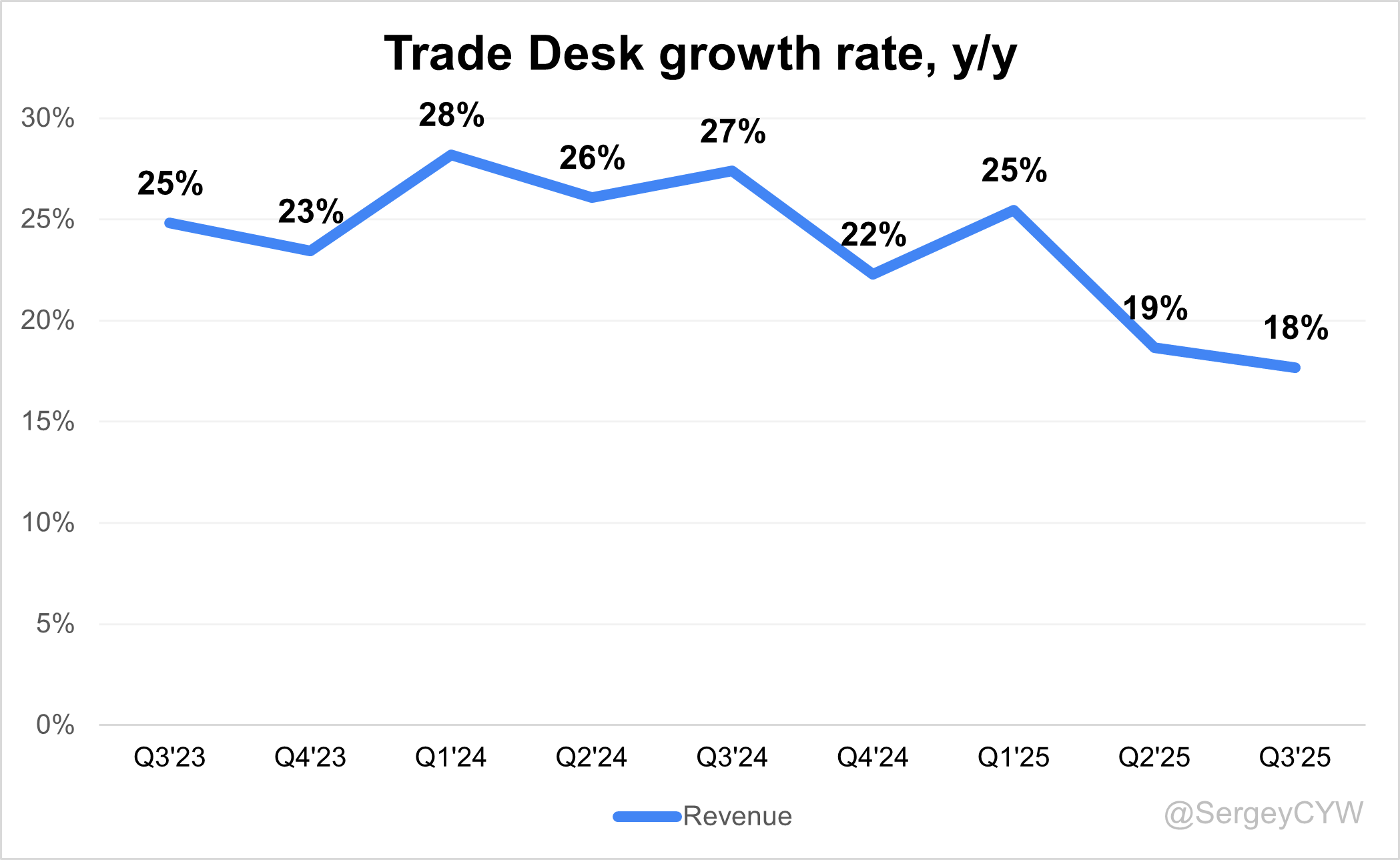 $TTD’s revenue growth slowed significantly from +27.4% YoY in Q3 2024 quarter to +17.7% in Q3 2025. If the company beats its forecast by 3.1% again, same as Q3, Q4 growth would be just 16.8%, indicating further deceleration in revenue growth.
